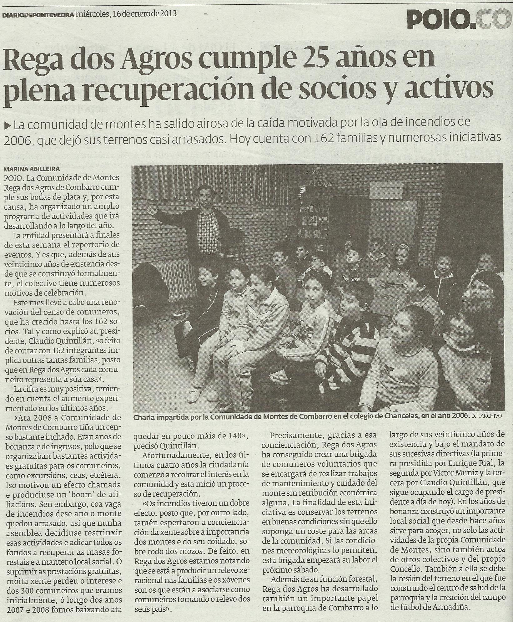 “Rega dos Agros cumple 25 años en plena recuperación de socios y activos”, por Marina Abilleira (Diario de Pontevedra, 16 de xaneiro de 2013.