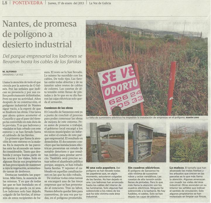 “Nantes, de promesa de polígono a desierto industrial“, en La Voz de Galicia (17 de xaneiro de 2013), por M. Alfonso.