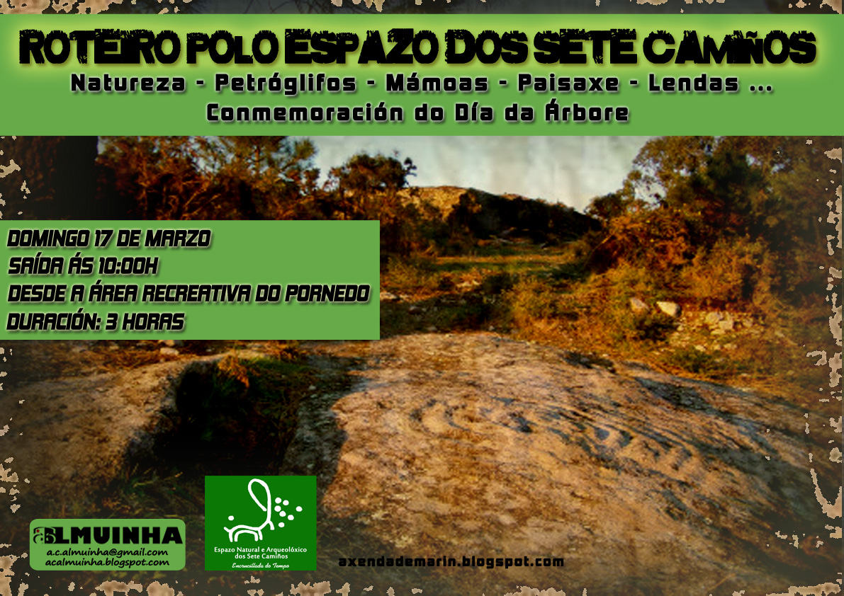 A A.C. Almuinha e a comisión técnica do proxecto para a creación do Espazo Natural e Arqueolóxico dos Sete Camiños organizamos un roteiro pola zona do Espazo dos Sete Camiños o vindeiro domingo 17 de Marzo, con saída ás 10:00h da Área Recreativa do Monte Pornedo. As persoas interesadas en participar tamén poden presentarse ás 09:45h na Parada de Autobuses de Marín, a carón da Alameda, para dirixirnos en vehículos ao punto de partida.