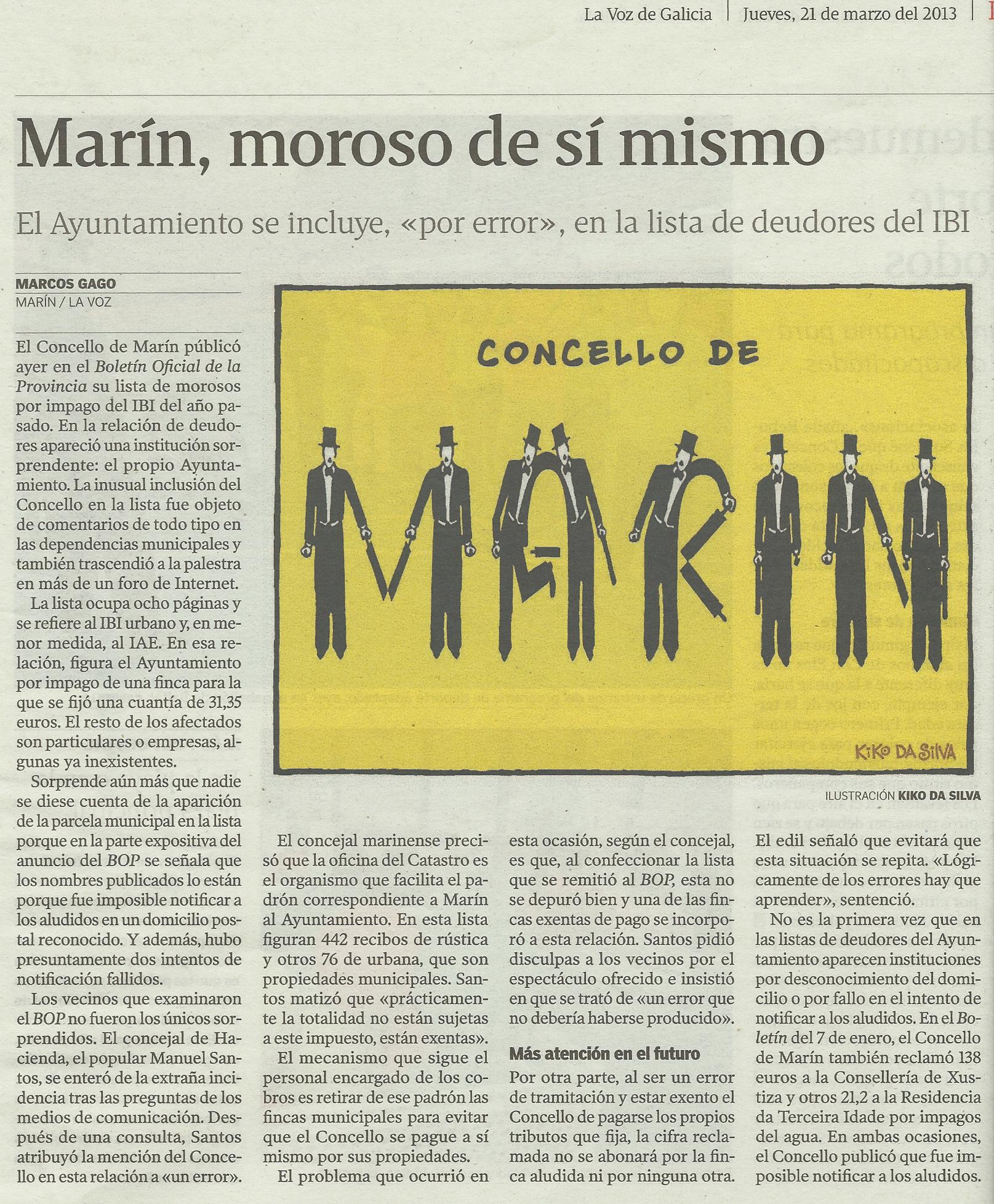 La Voz de Galicia, 21 de marzo de 2013: “Marín, moroso de sí mismo“. El Ayuntamiento se incluye, «por error», en la lista de deudores del IBI.