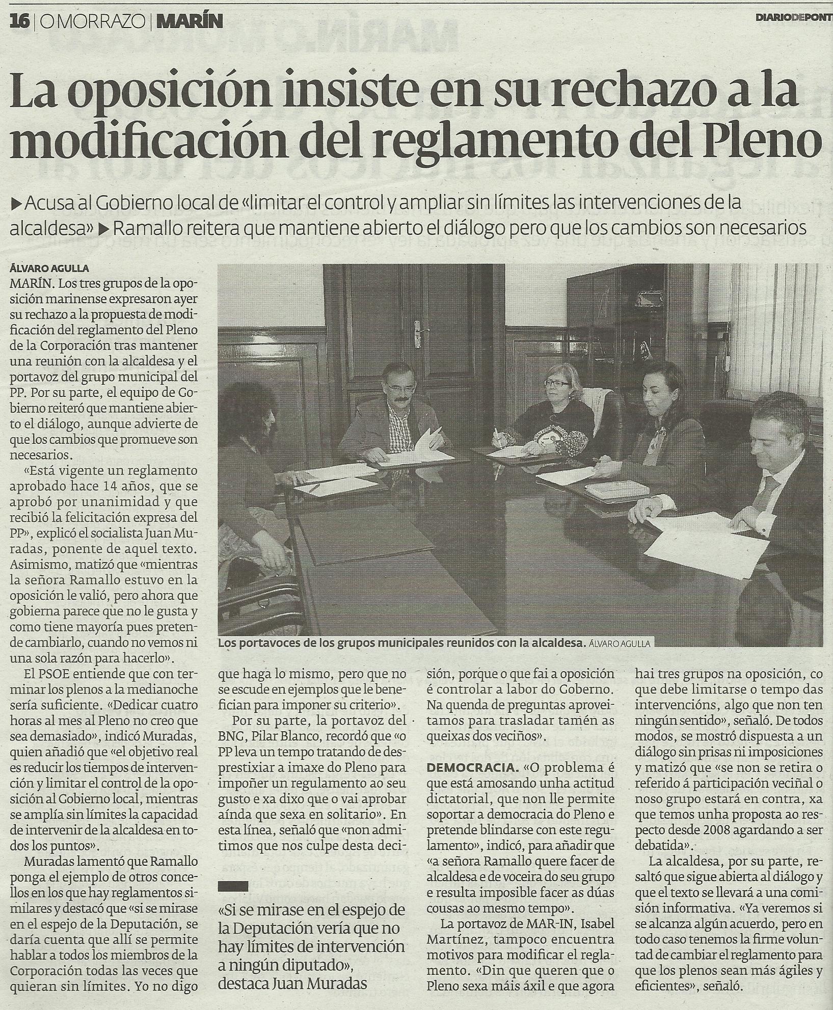 REDACCIÓN – MARÍN La oposición en bloque mostró ayer su disconformidad con el gobierno local después de la celebración de la junta de portavoces en la que se abordó la posible modificación del reglamento que rige los plenos.
