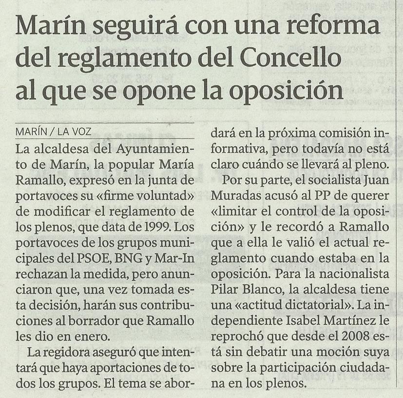 Faro de Vigo, 22 de marzo de 2013: “Ejecutivo local y oposición, sin acuerdo para modificar el reglamento plenario“.