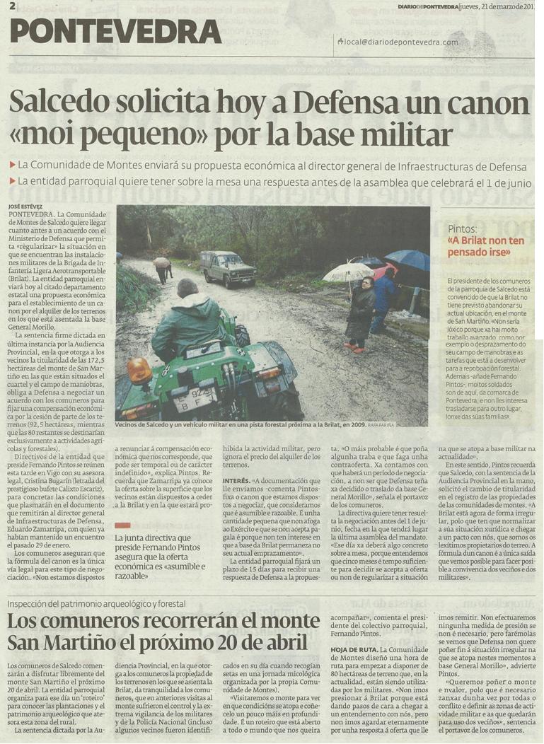 Esta semana finaliza o “prazo” que a Comunidade de Montes de Salcedo lle deu á Brilat para respostar á súa proposta do canon económico establecido como contrapartida polo uso militar de 92,5 hectáreas de monte veciñal. Trala Semana Santa, e transcurridos 15 días dende o envío desa oferta negociable, a pelota está no tellado do Ministerio de Defensa. A Comunidade de Montes de Salcedo considera que o monte está “moi abandonado” e por iso este vindeiro 20 de abril van realizar unha ruta de recoñecemento para analizar a situación dos recursos forestais e do patrimonio arqueolóxico. A andaina estará aberta á participación da cidadanía.