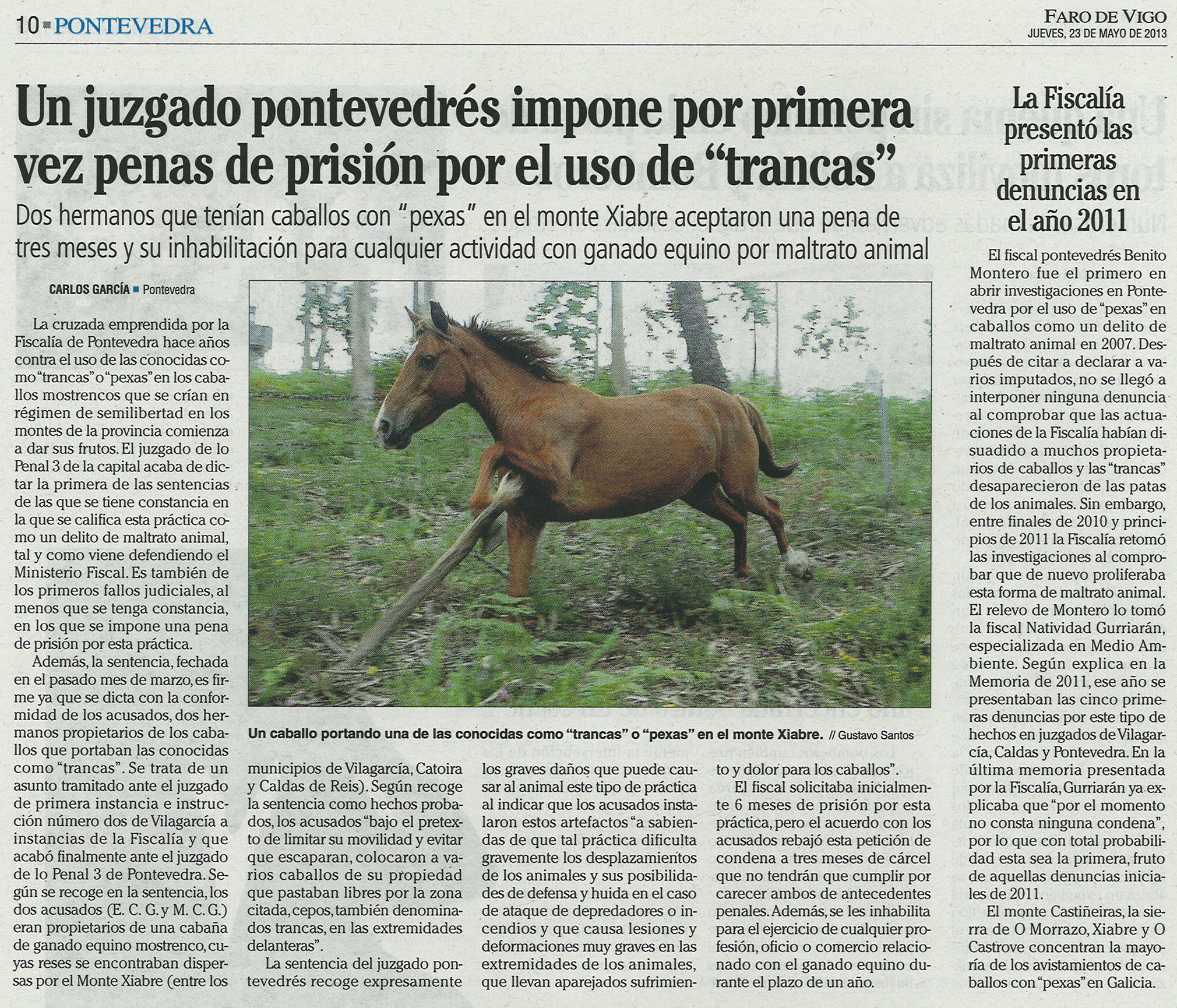 Este tipo de prácticas tan crueis e irracionais van deixar de pasar impunes. Pasou tempo dende que a Fiscalía comezou a interesarse polo caso do gando equino cuxos propietarios os ceiban no monte portando nas súas extremidades pexas, trancas, cordas ou cadeas coas que limitan a súa mobilidade. Pero semella que a xustiza, malia que lenta, está empezando a ser eficaz ante esta problemática do maltrato animal. Que esta condena non sexa a primeira porque, non só no Monte Xiabre, senón tamén nos montes do Morrazo, de Pontevedra, do Val Miñor, hai eguas e cabalos nesta penosa situación mentres os seus donos están tranquilamente nas súas casas, sen preocuparse o máis mínimo pola sorte que corren estes animais, correndo perigo ao non poder defenderse dos depredadores, transitando por estradas nas que circulan vehículos, ou arruinando a colleita de calquera labrego para buscar alimento.