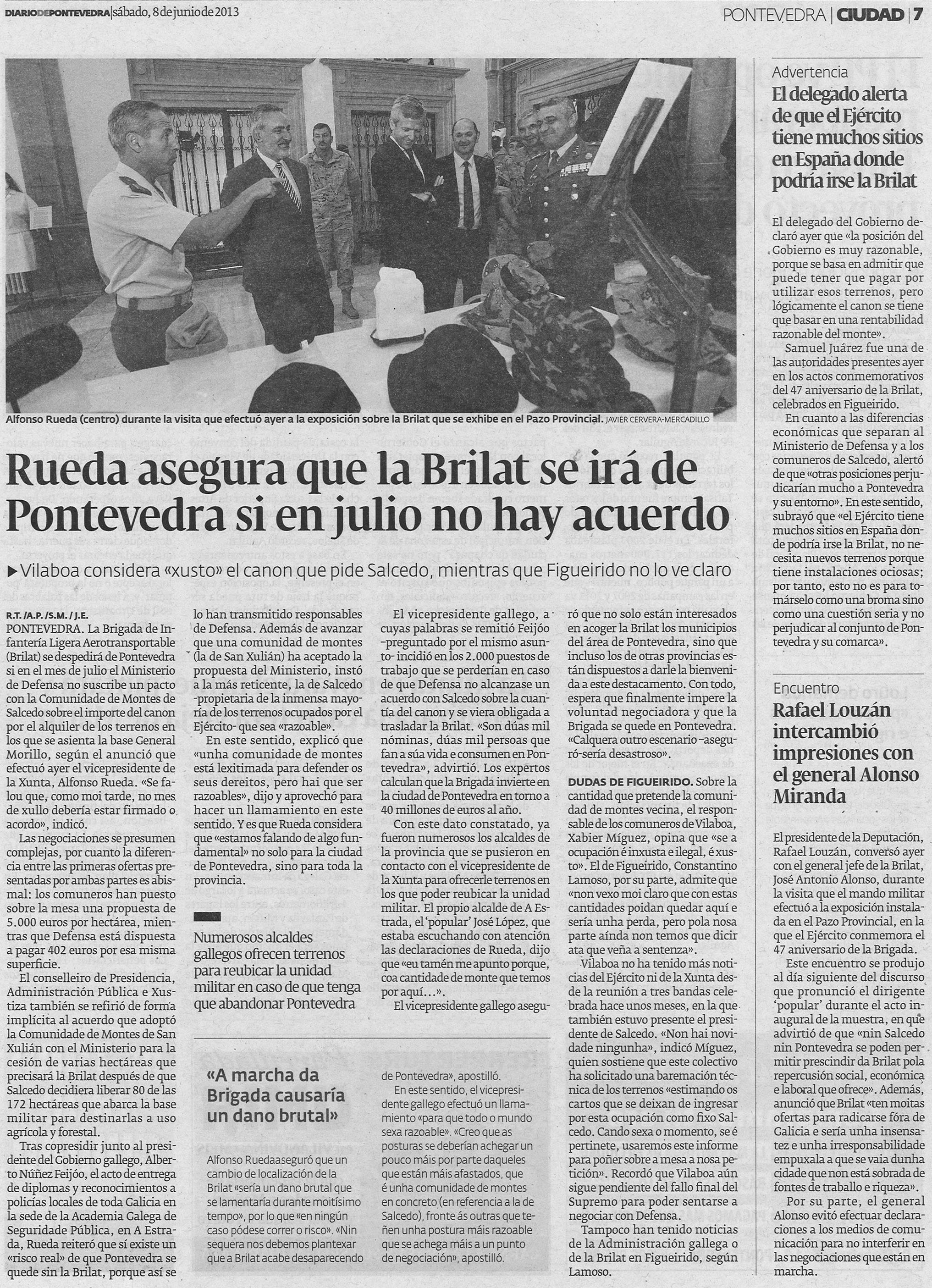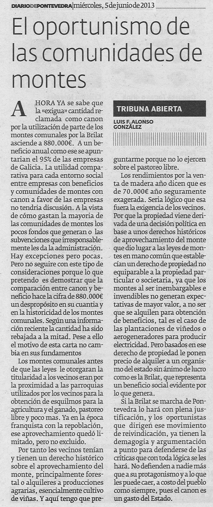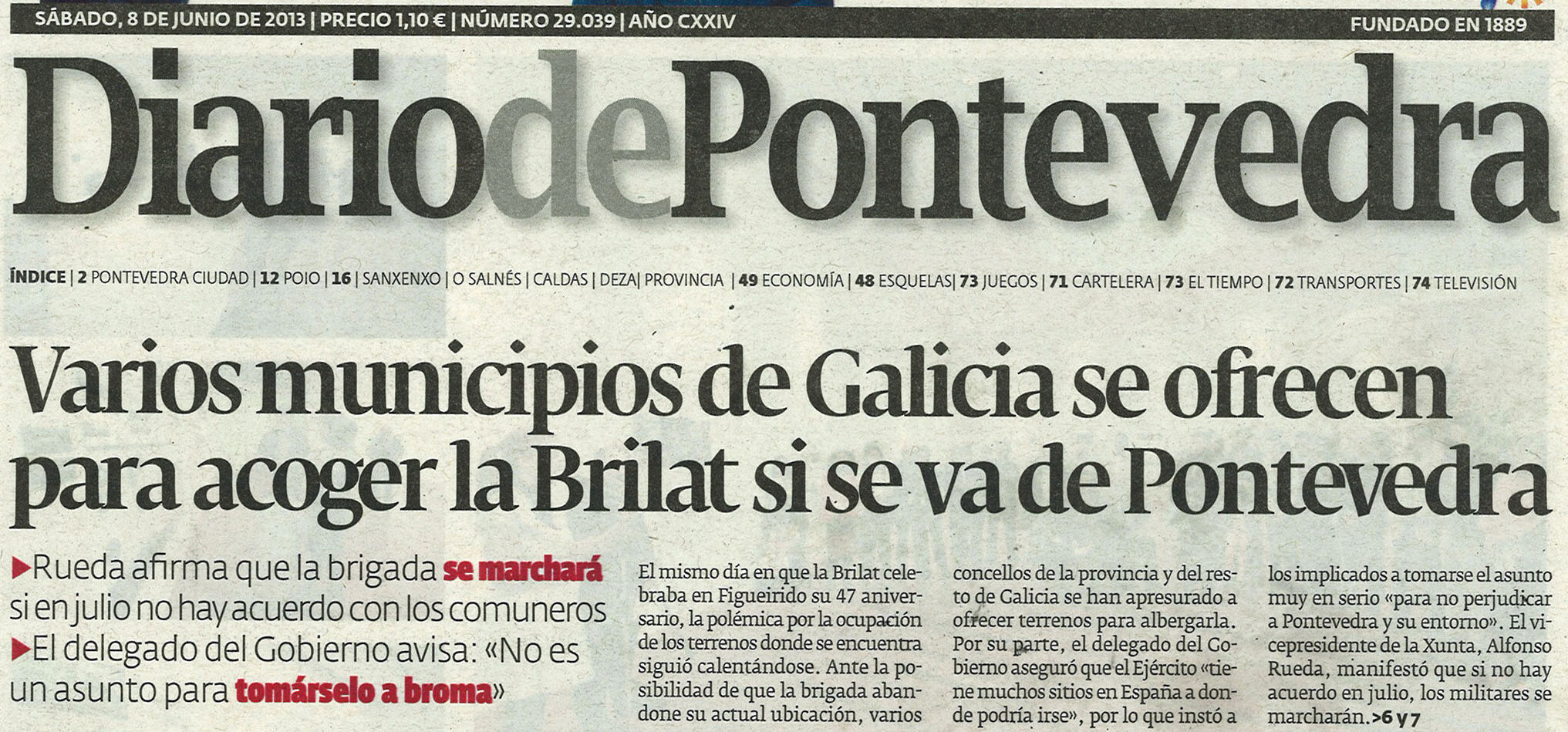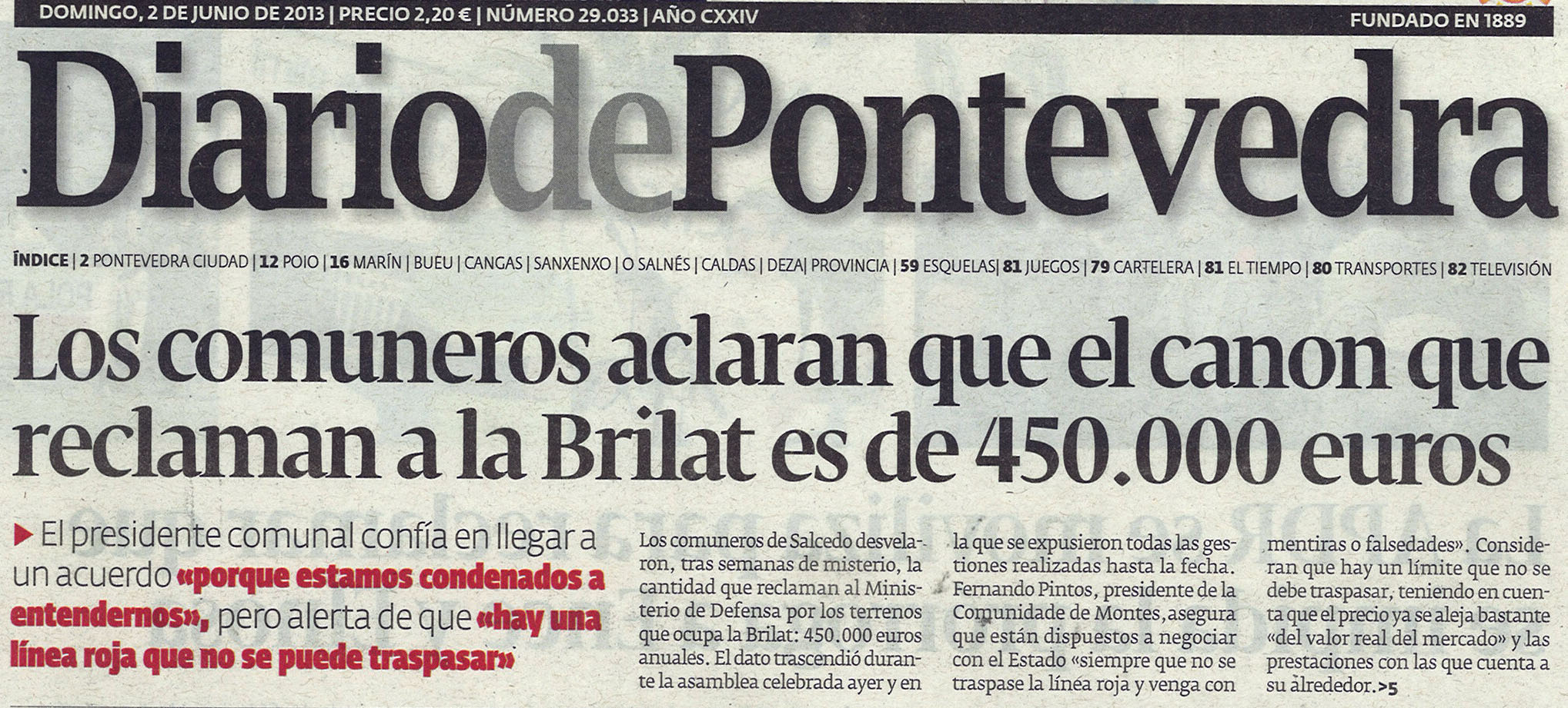 Non quedan tan lonxe as manifestacións, pancarta en ristre, da directiva anterior (máis ou menos idéntica á actual en cadros e filosofía) “en defensa dos nosos montes”, facendo alarde de dar pouco menos que o sangue por arredar as propiedades comunais das malvadas poutas dos militares acaparadores. Uns preferían dalas de balde para o polígono antes que a Brilat as levase pola cara. Así de facilmente viraron as tornas, que agora é San Xulián a que se desmarca de Salcedo convertíndose na primeira que lle di “si, bwana” ao Exército que antano tildaba pouco menos que de opresor e ocupador.