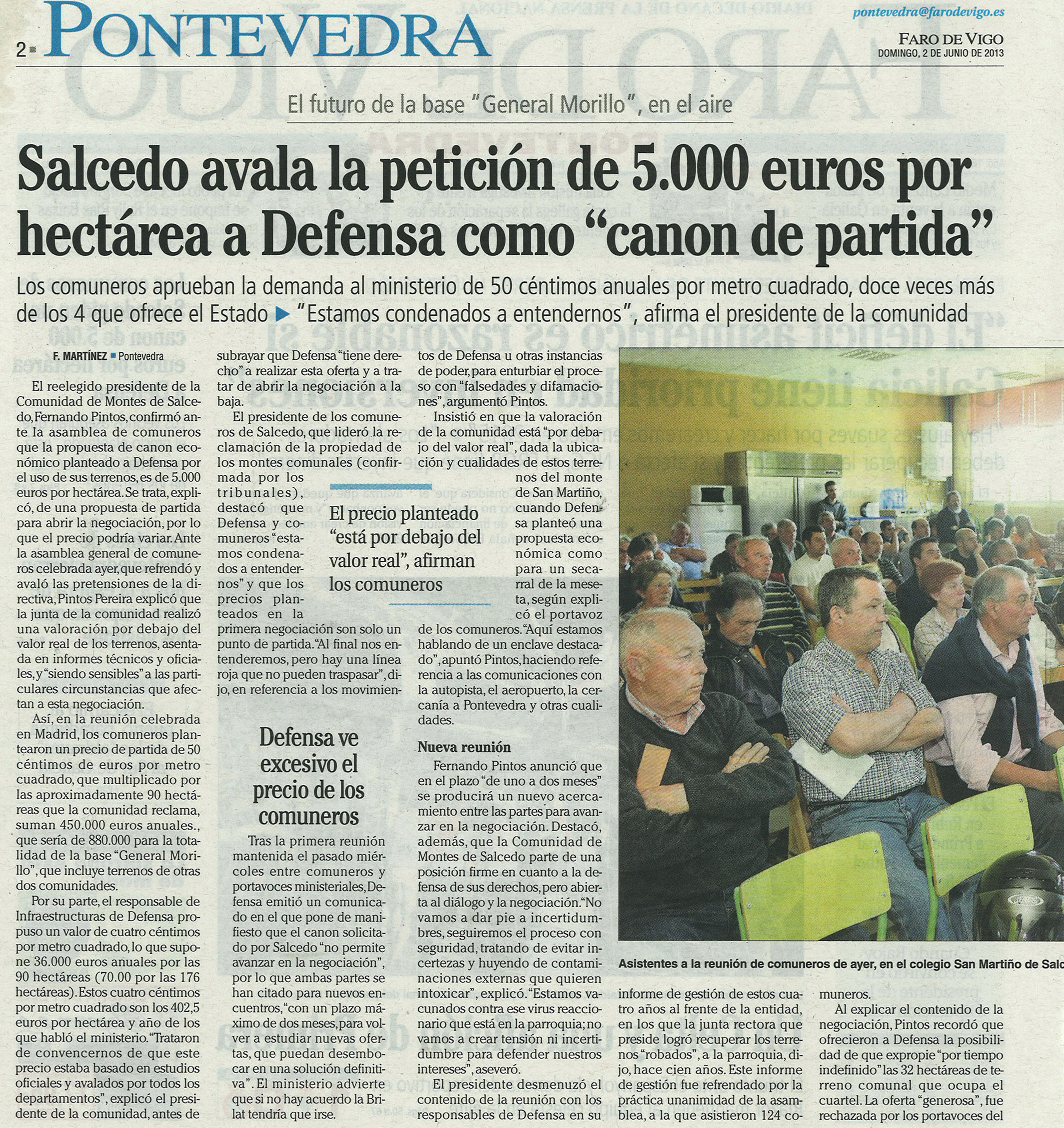 As nosas fontes aseguran que os directivos de San Xulián chamaban con moita frecuencia aos comuneiros de Salcedo agardando como auga de maio calquera noticia sobre o comezo das negociacións co Ministerio para saber canto ían pedir, como se aquí non houbera idea de defender o propio e houbera que agardar a que os de fóra deran o primeiro paso. Coa experiencia que teñen os comuneiros maiores de San Xulián negociando expropiacións (liña de alta tensión, variante, etc). Total, para que, á primeira de cambio, xa se pregaran á oferta inicial de Defensa, ou do PP, que tanto monta, monta tanto. Para esta viaxe non cumprían tantas alforxas.