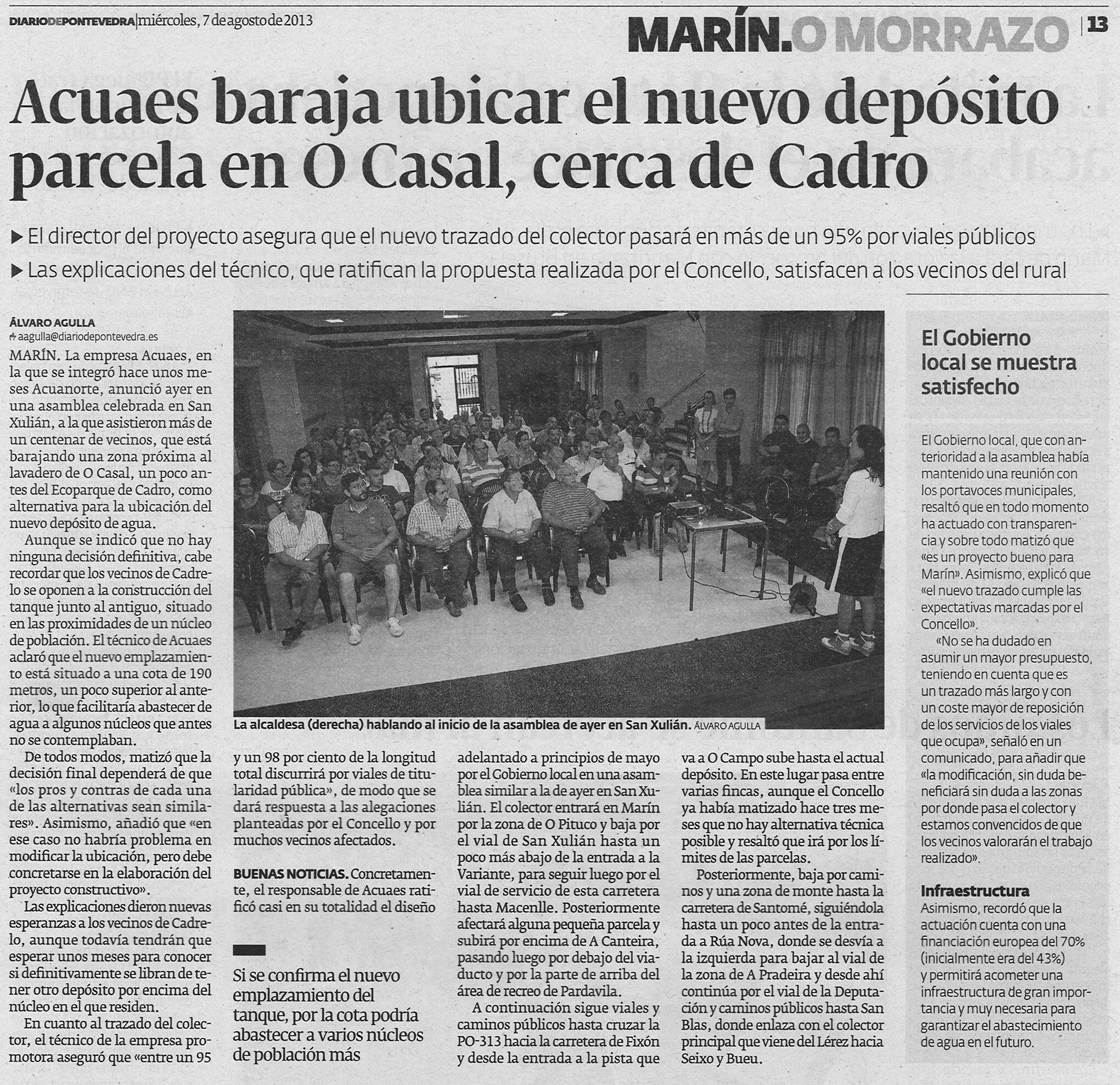 “As afeccións van ser mínimas, agás para o novo depósito”, aclarou César Prieto, que precisou que se están barallando alternativas para a súa ubicación. Apuntou ao lugar do Casal, na zona de Cadro. Se no primeiro proxecto o depósito se localizaba próximo ao xa existente, César Prieto sinalou que a decisión respondía ao criterio de “agrupar infraestruturas para evitar ir poñendo cousas por todo o concello”.