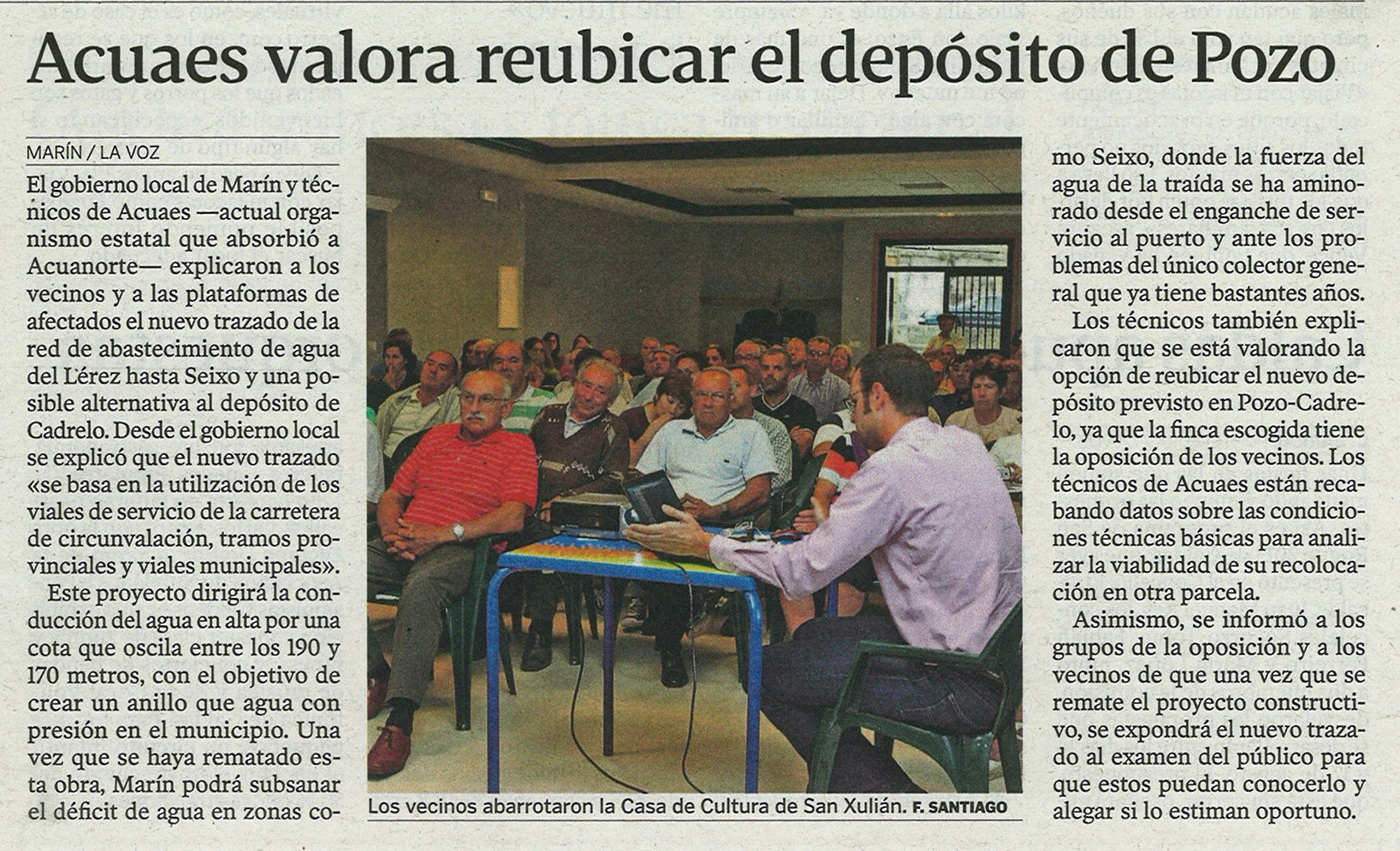 O director do proxecto da nova rede de abastecemento de auga que proxecta Acuaes -anterior Acuanorte- estivo na Casa de Montes de San Xulián para explicarlle aos veciños o proxecto alternativo no que están traballando. César Prieto comezou precisando que a Sociedade Estatal aceptara a alegación do Concello de Marín e que el mesmo atendera a moitos afectados que demandaran información. Tamén explicou que o proxecto orixinal redactárase en 2010, cando o PXOM aínda non estaba aprobado e que agora, habendo un planeamento urbanístico, parecíalle “razoable e lóxico” que os técnicos do proxecto se adecuaran aos novos condicionantes.