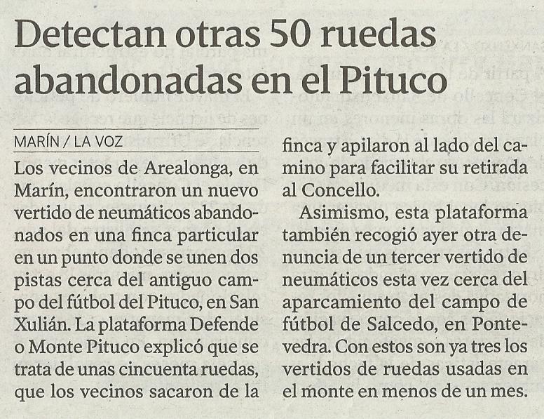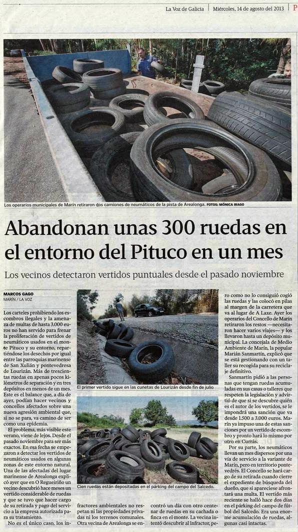 O Concello de Marín vén de ordenar a retirada do centenar de rodas que foran abandonadas nunha finca particular, a carón do antigo campo de fútbol do Pituco. Dende que esta agresión ambiental fora denunciada por unha veciña, publicada en DEFENDE O MONTE PITUCO, reiterada a incidencia ante a concelleira de Medio Ambiente, e difundida pola prensa local, os responsables municipais foron dilixentes na recollida dos neumáticos.
