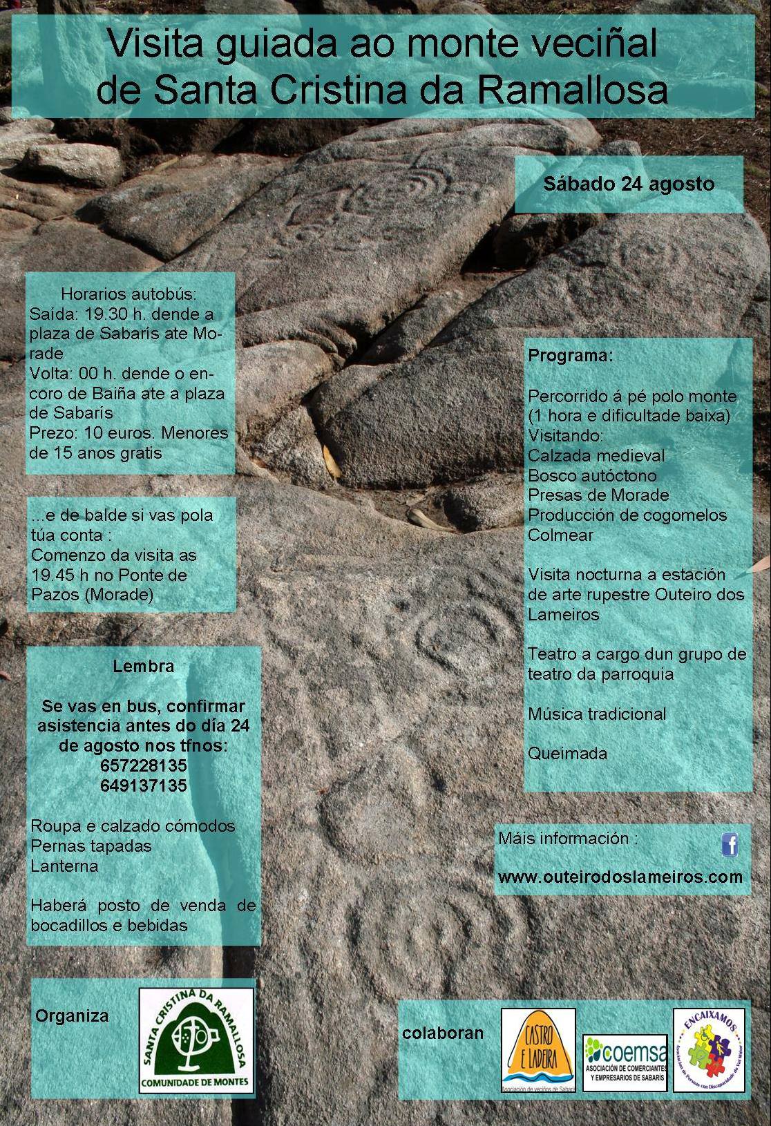 E outra entidade veciñal que apoia a conservación e promoción do seu patrimonio arqueolóxico: a Comunidade de Montes de Santa Cristina da Ramallosa, en Baiona, organiza para este sábado 24 de agosto unha visita aos petróglifos de Outeiro dos Lameiros. É un exemplo de “como se lo montan” os que apostan polo patrimonio arqueolóxico como motor de dinamización económica. Cómpre prestar atención ao cartaz: