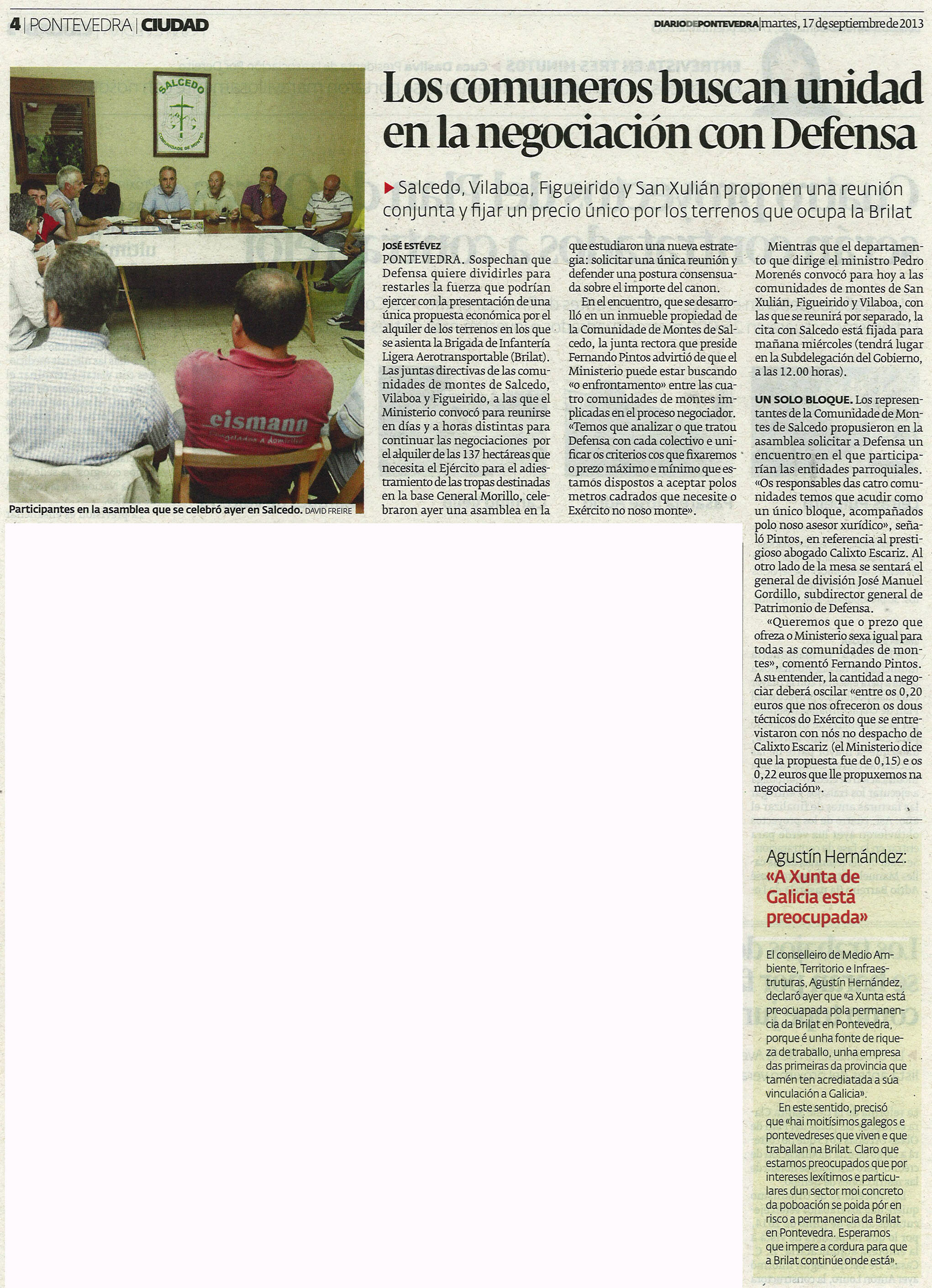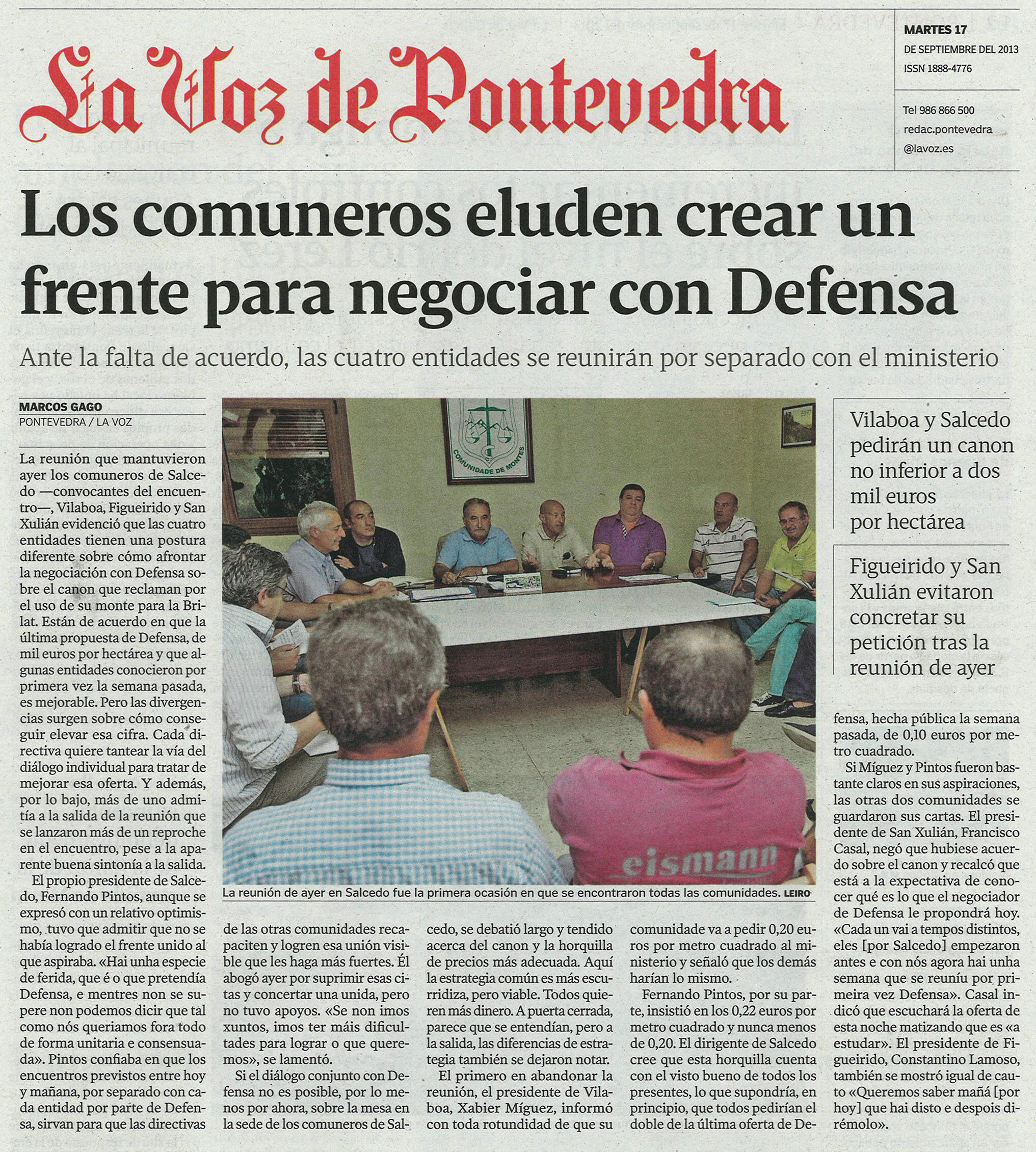 Non foi posible acadar o acordo que a Comunidade de Montes de Salcedo lle plantexou este luns aos directivos dos comuneiros de Vilaboa, Figueirido e San Xulián: a priori, as dificultades non radicaban tanto na valoración dos terreos por parte das comunidades, senón na negativa por parte de San Xulián e Figueirido, principalmente, para formar parte desa fronte común. Os presidentes destas dúas comunidades marcharon explicando, logo de hora e media de reunión, que querían acudir pola súa conta ao encontro ao que Defensa os convocara individualmente. O de Figueirido argumentaba que só tiveran dúas entrevistas cos representantes do Ministerio; o de San Xulián, que só falaran oficialmente nunha ocasión. A diferenza entre as dúas comunidades é que, mentres os de Figueirido xa celebraron hai uns días unha asemblea de comuneiros para informar da evolución das conversas, en San Xulián non houbo ningunha convocatoria de asemblea xeral recente e os comuneiros non votaron nin aprobaron nada.