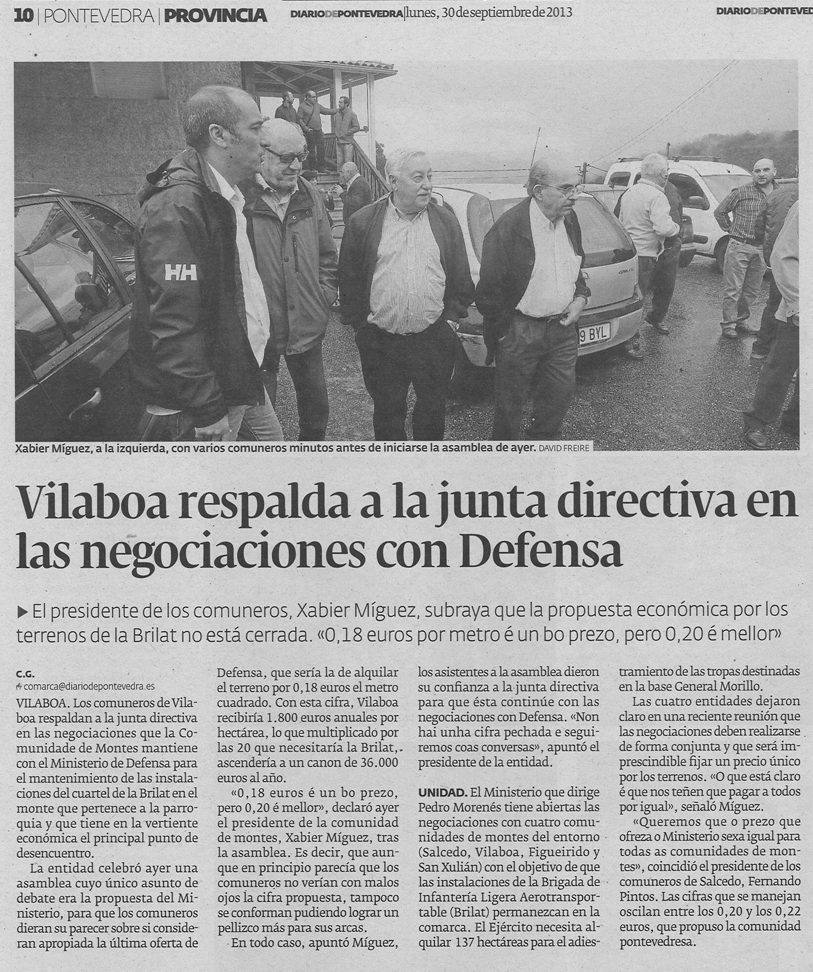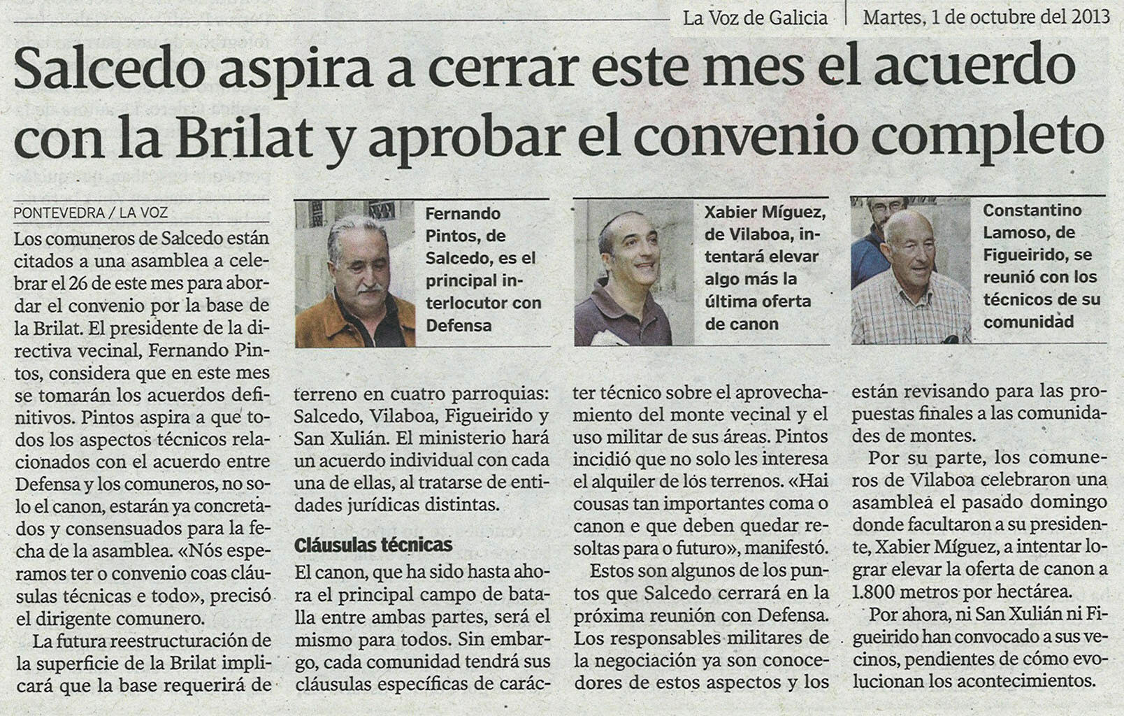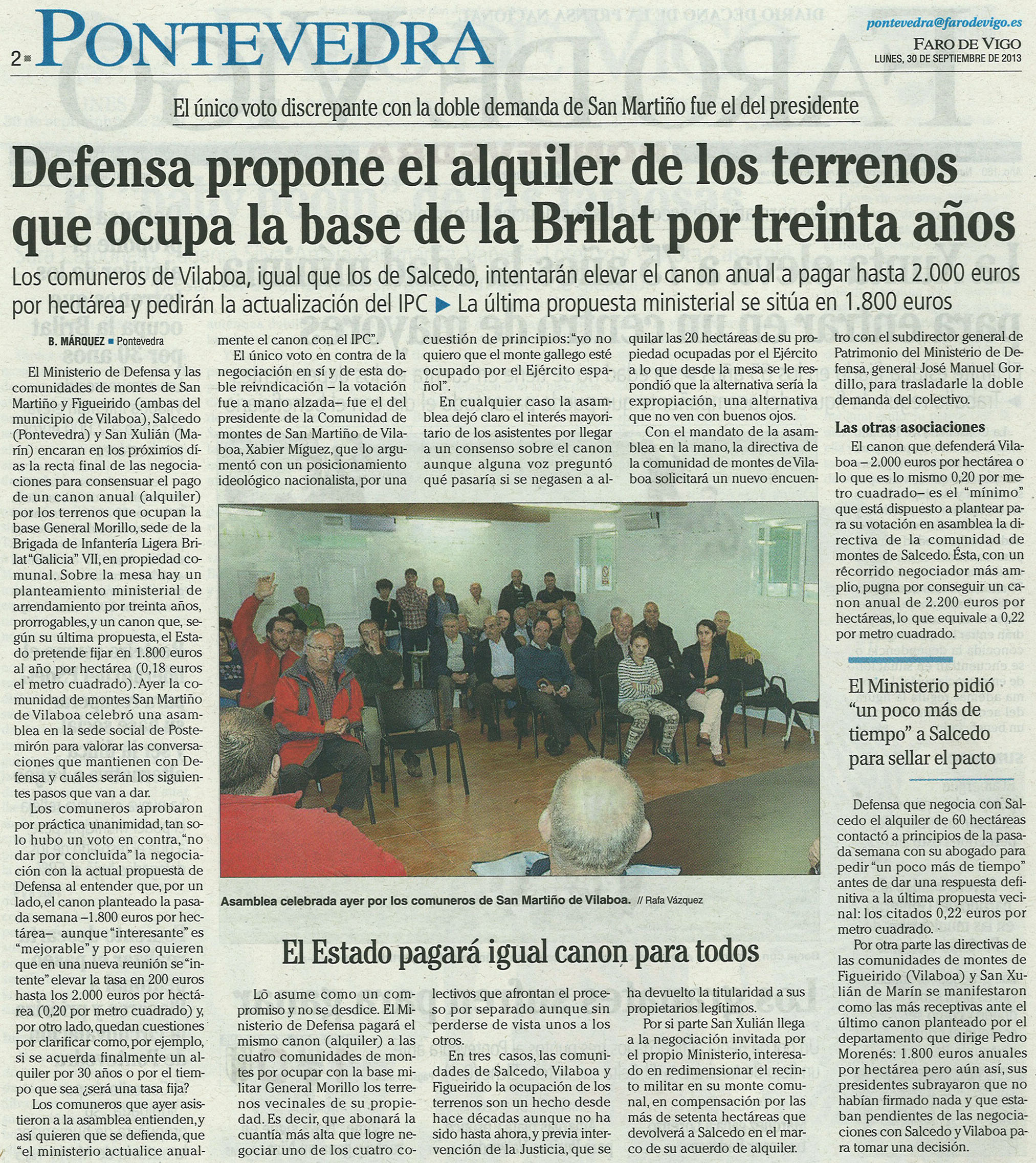 Los comuneros de Vilaboa, igual que los de Salcedo, intentarán elevar el canon anual a pagar hasta 2.000 euros por hectárea y pedirán la actualización del IPC – La última propuesta ministerial se sitúa en 1.800 euros