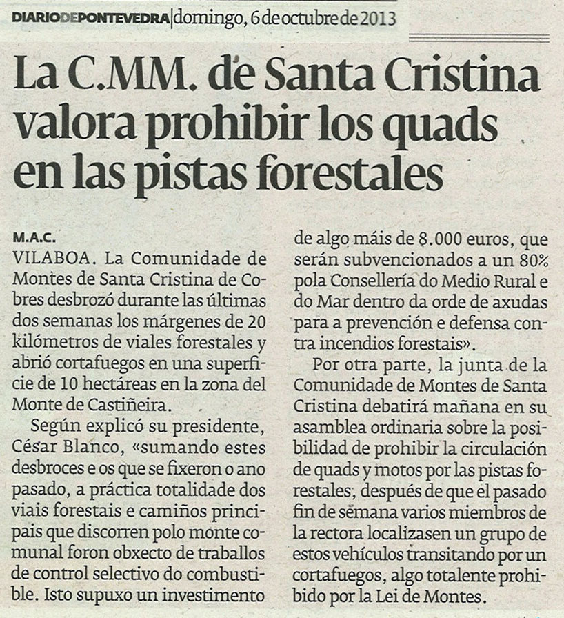 “A práctica totalidade dos viais forestais e camiños principais que discorren polo monte comunal foron obxecto de traballos de control selectivo de combustible. Isto supuxo un investimento de algo máis de 8.000 euros, que serán subvencionados nun 80% pola Consellería de Medio Rural”.