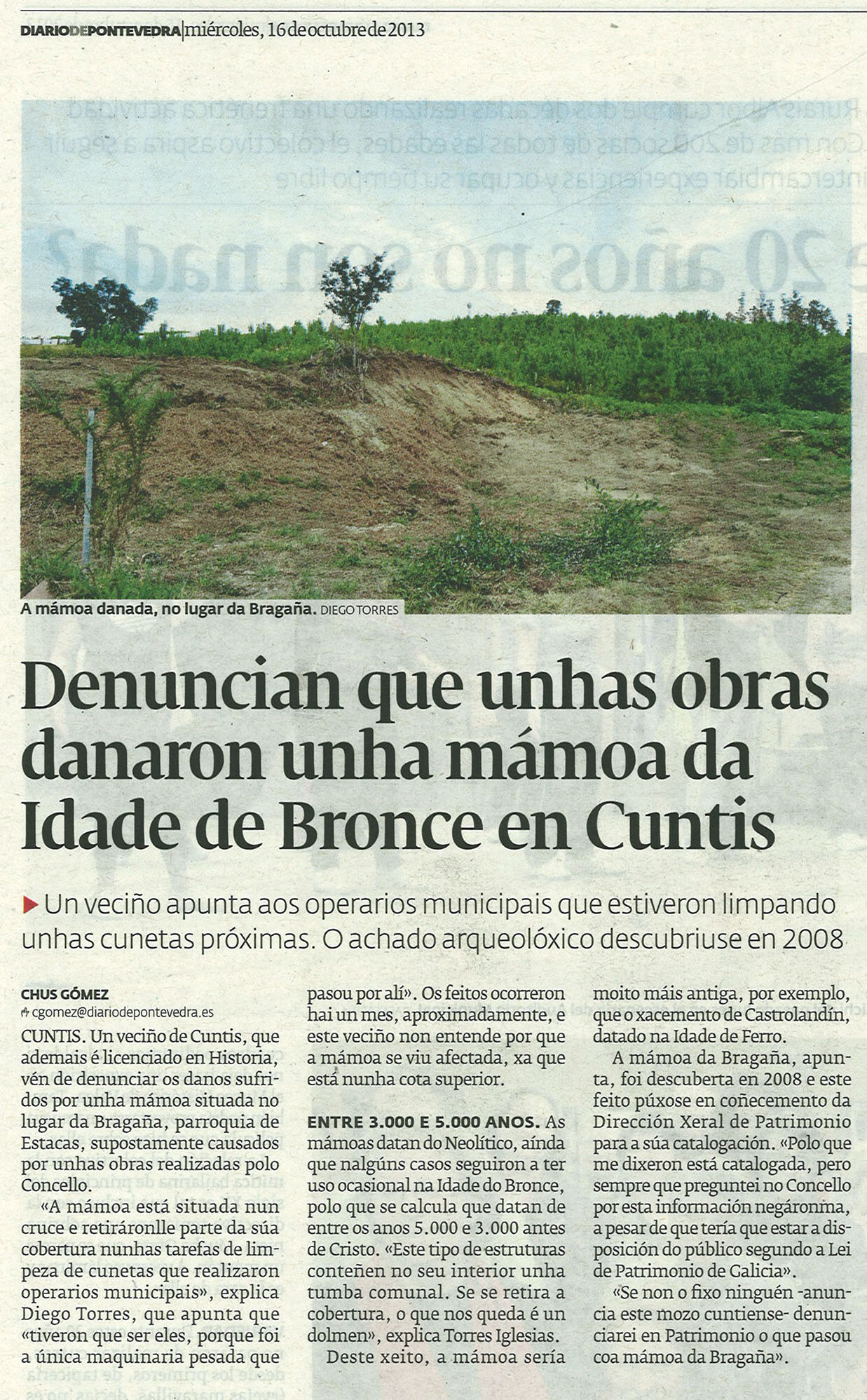 Un vecino de Cuntis, que además es licenciado en Historia, viene de denunciar los daños sufridos por una mámoa ubicada en el lugar de la Bragaña, parroquia de Estacas, supuestamente causados por unas obras realizadas por el Ayuntamiento.