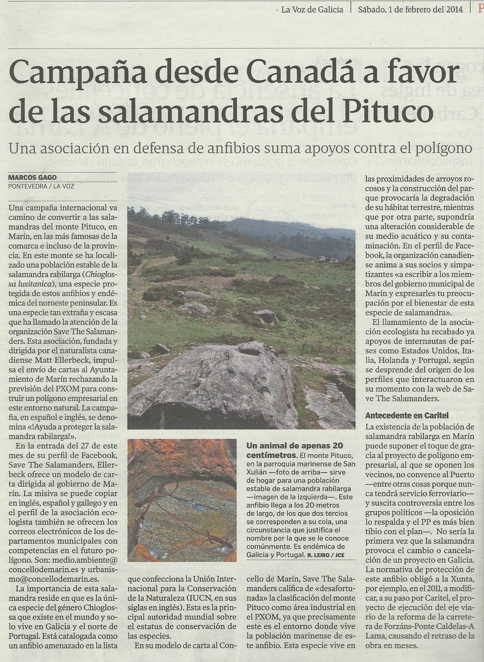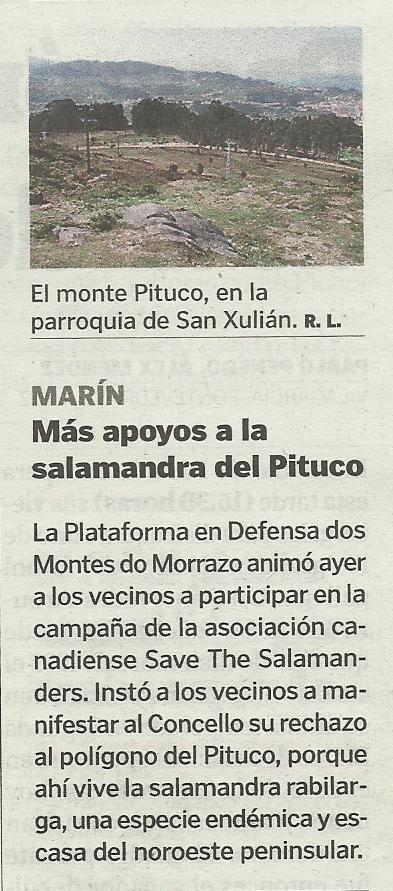 La organización Save The Salamanders, fundada y dirigida por el naturalista canadiense Matt Ellerbeck, acaba de emprender una campaña de mensajes dirigidos al Ayuntamiento de Marín para demandarle al Gobierno local que no se construya ningún polígono industrial en el Monte Pituco (o Pornedo), tal y como proyecta el replanteo urbanístico al clasificar esta zona como suelo urbanizable.