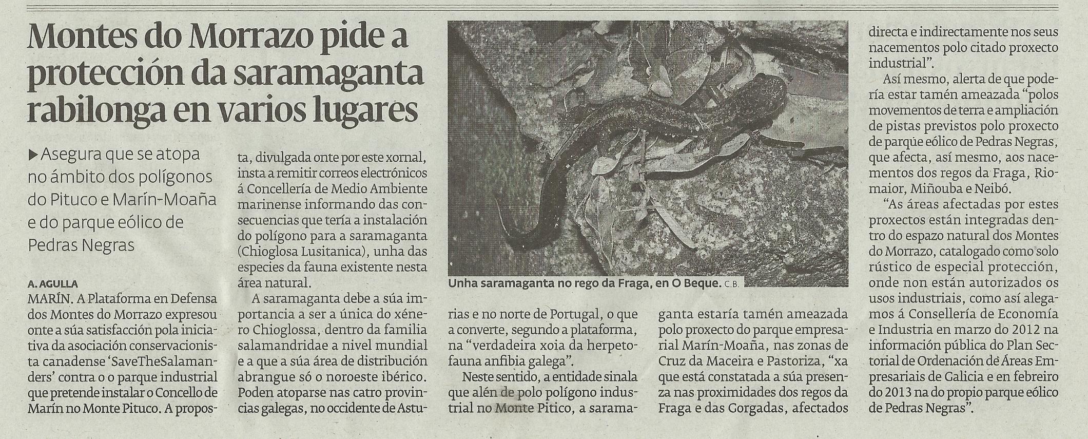 La Plataforma en Defensa dos Montes do Morrazo se puso en contacto durante los últimos días con la asociación canadiense “Save The Salamanders” para proteger a las salamandras que habitan en el entorno de Moaña y Marín. Según indica el colectivo, esta especie está catalogada como “vulnerable” dentro del Catálogo Galego de Especies Ameazadas. Sin embargo, proyectos como el polígono industrial de Monte Pornedo o el parque eólico Pedras Negras suponen un peligro para el hábitat de esta especie.