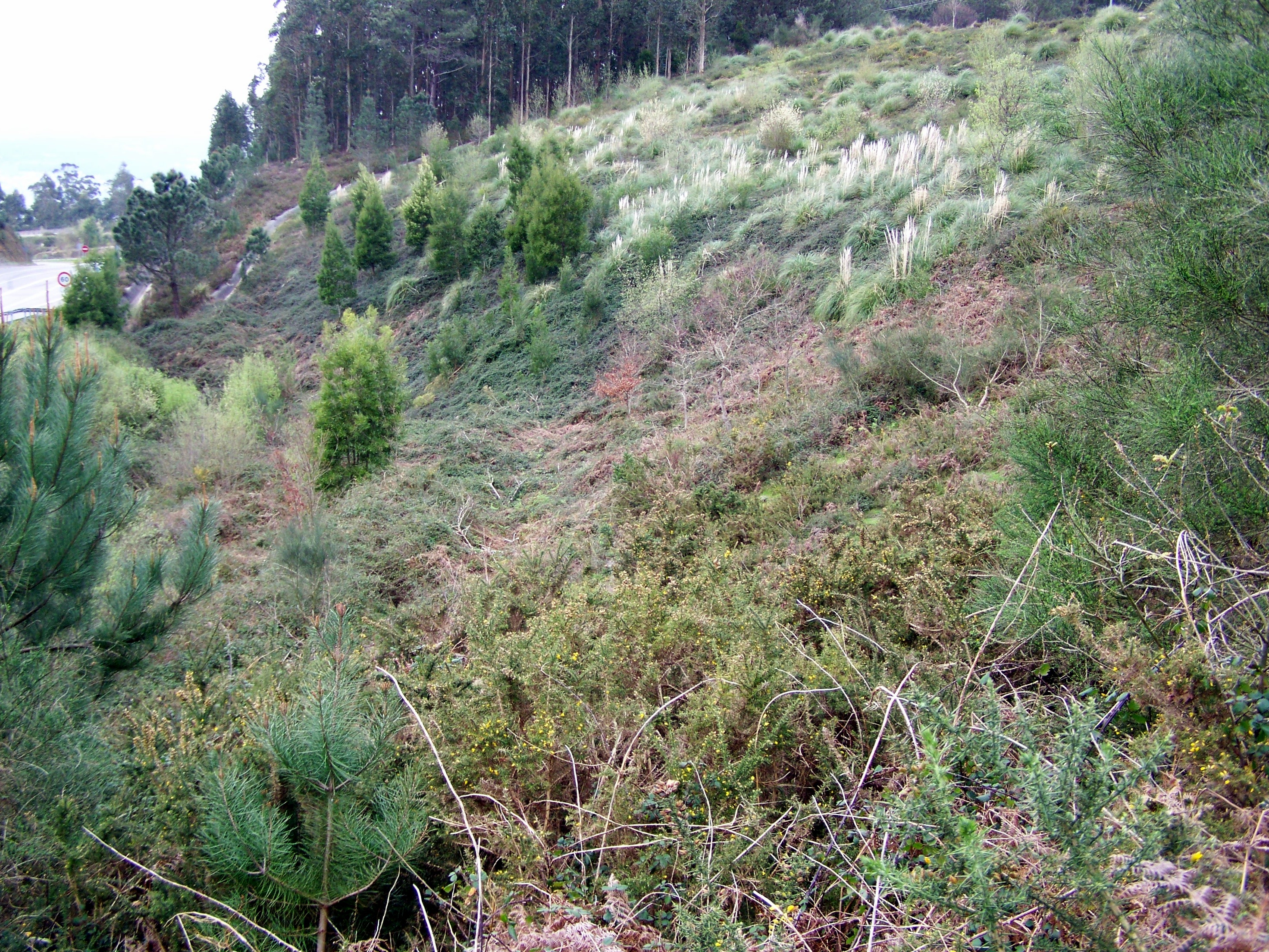 A praga da invasiva herba da Pampa, a vexetación que medra de xeito descontrolado. Son algunhas eivas que arrastra o recheo realizado a carón da Variante. Moitos cartos ten gastado a Comunidade de Montes en desbrozar unha parte desta zona. Un investimento en balde, tendo en conta que a planta da cortadeira só se pode erradicar arrincándoa de raíz, para o que se precisan medios mecánicos de certo calibre.