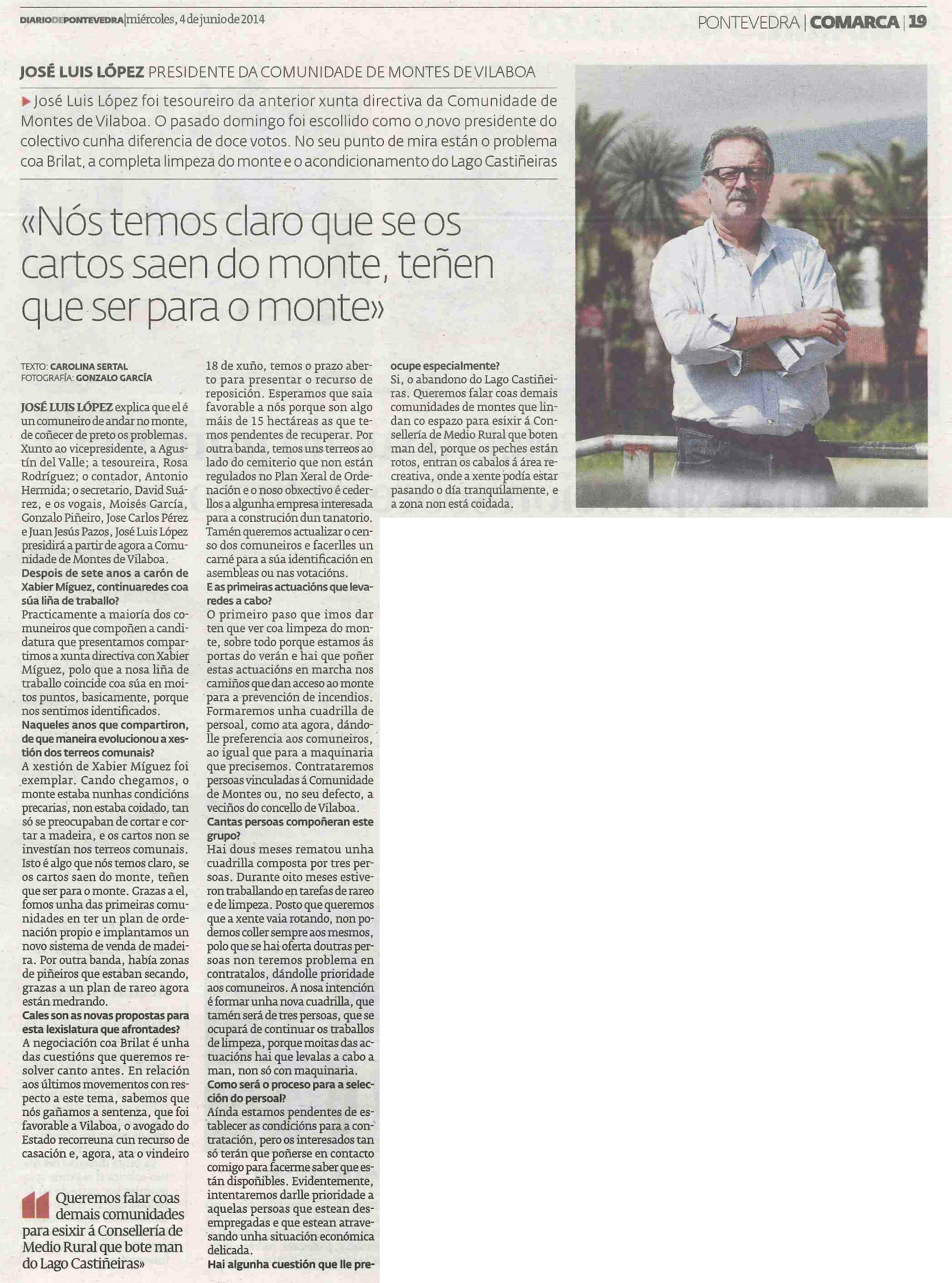 José Luís López e o novo presidente da Comunidade de Montes de Vilaboa. Releva no cargo a Xabier Míguez. Nesta entrevista publicada no Diario de Pontevedra xa anticipa as claves da súa xestión.