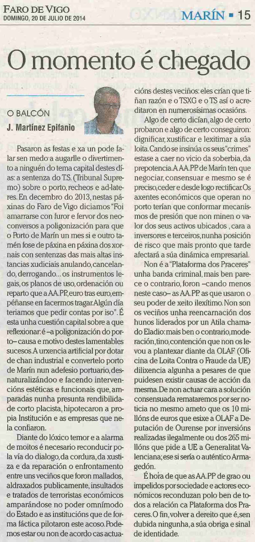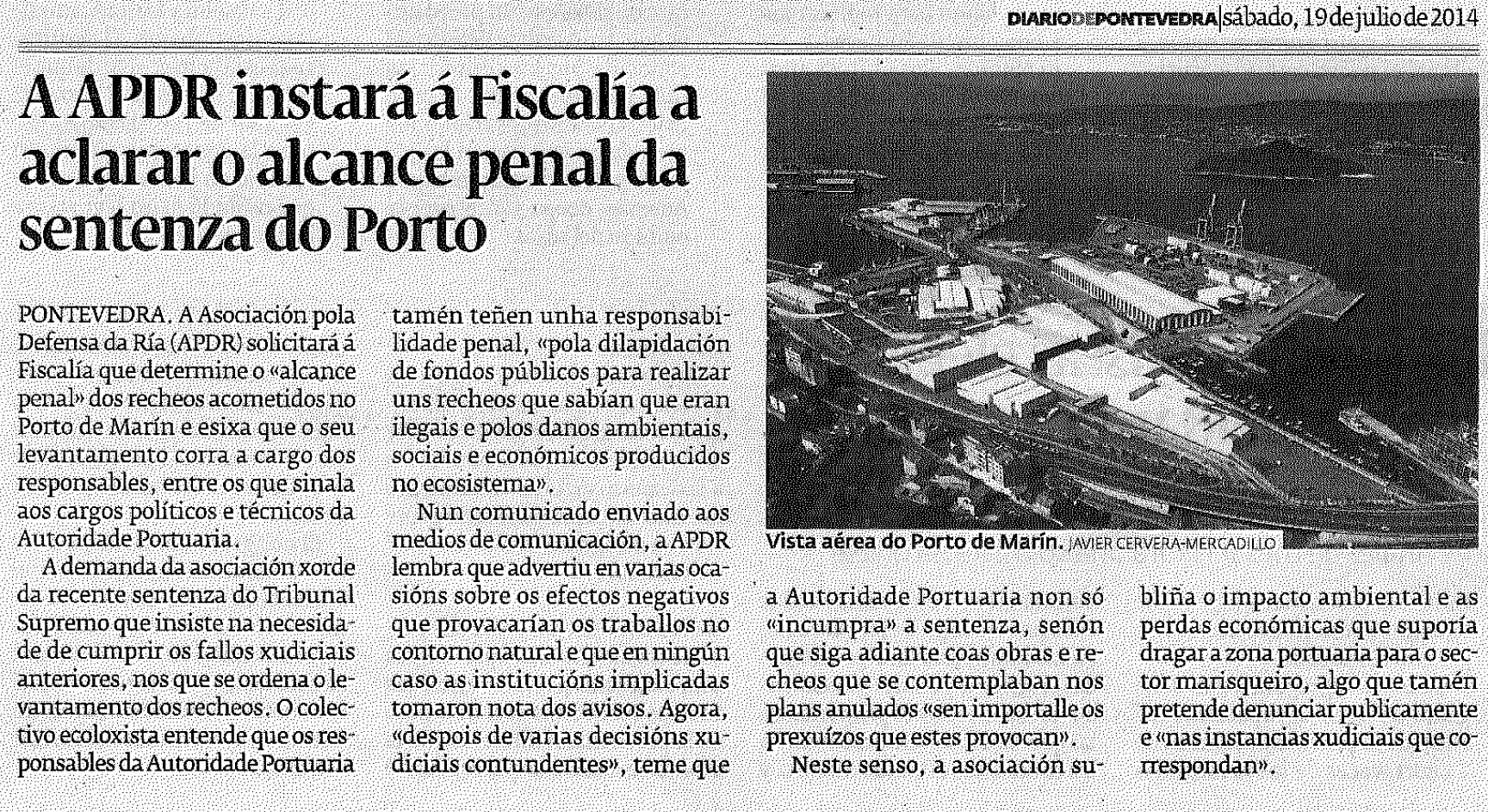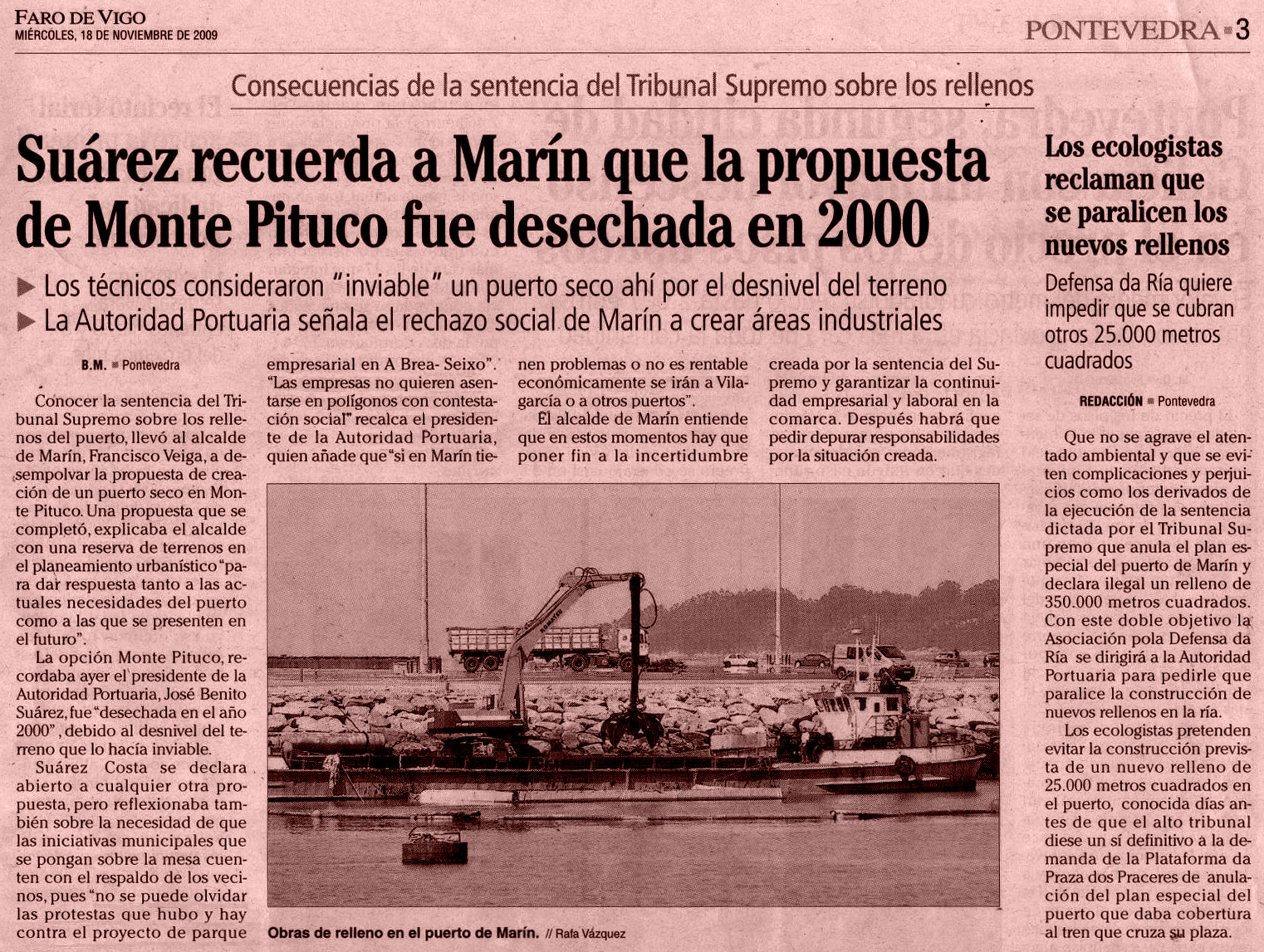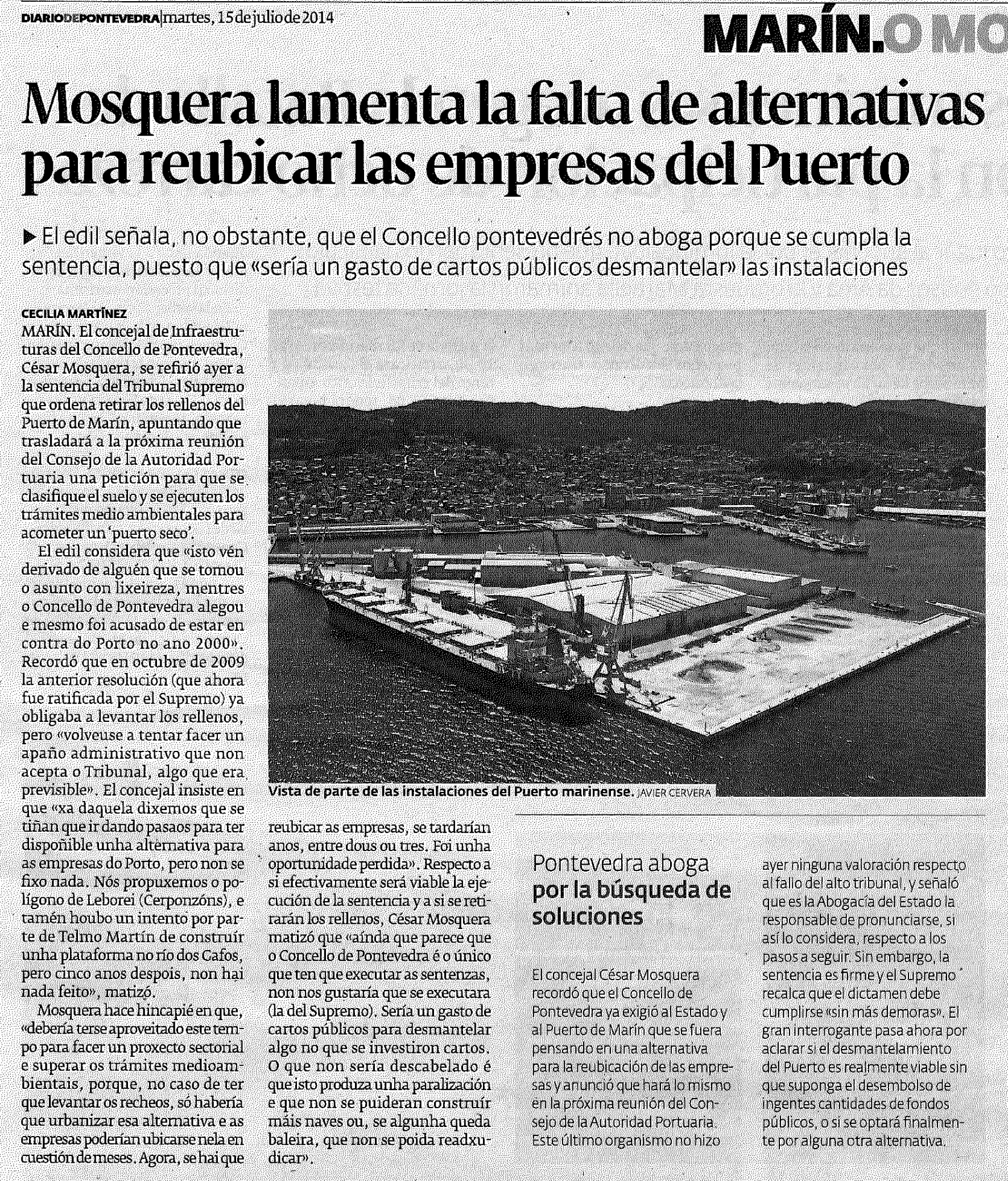 A prensa local fíxose eco neste día dun comunicado do alcalde de Ponte Caldelas sobre a sentenza do Tribunal Supremo que recalca a ilegalidade de 300.000 metros cadrados de recheos realizados no Porto de Marín, quedando varias empresas asentadas neses terreos nunha precaria situación xurídica. Perfecto Rodríguez fixo un chamamento para que prime o sentido común por riba doutros intereses, nunha aposta clara por posicionar o parque empresarial da Reigosa como ubicación alternativa.