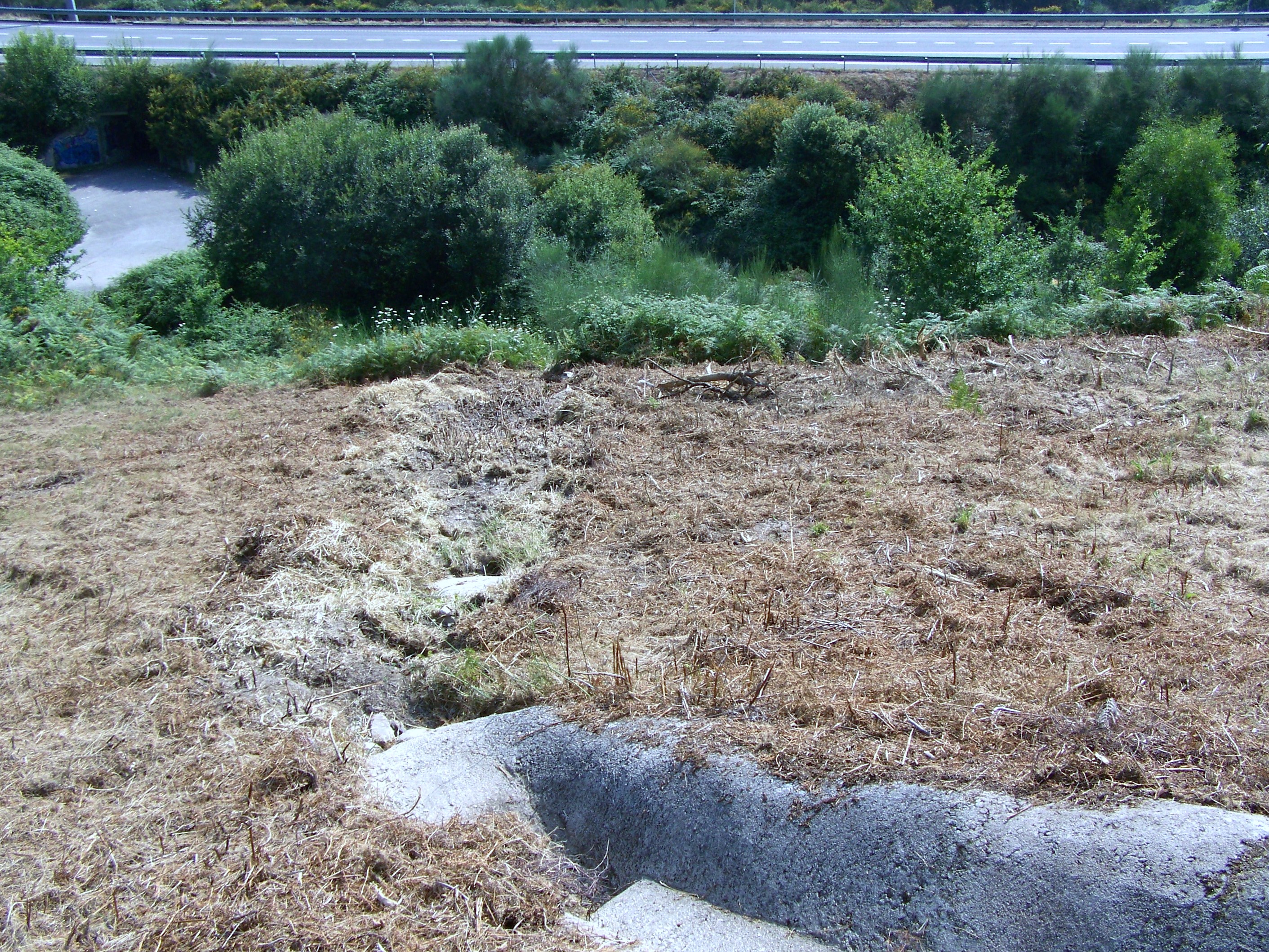 O terraplén a carón da “escalinata” pola que baixan as augas pluviais do monte foi PARCIALMENTE desbrozado nas últimas semanas. Os operarios tiveron a pericia de talar unhas acacias que estaban medrando, evitando así a propagación desta especie invasora.