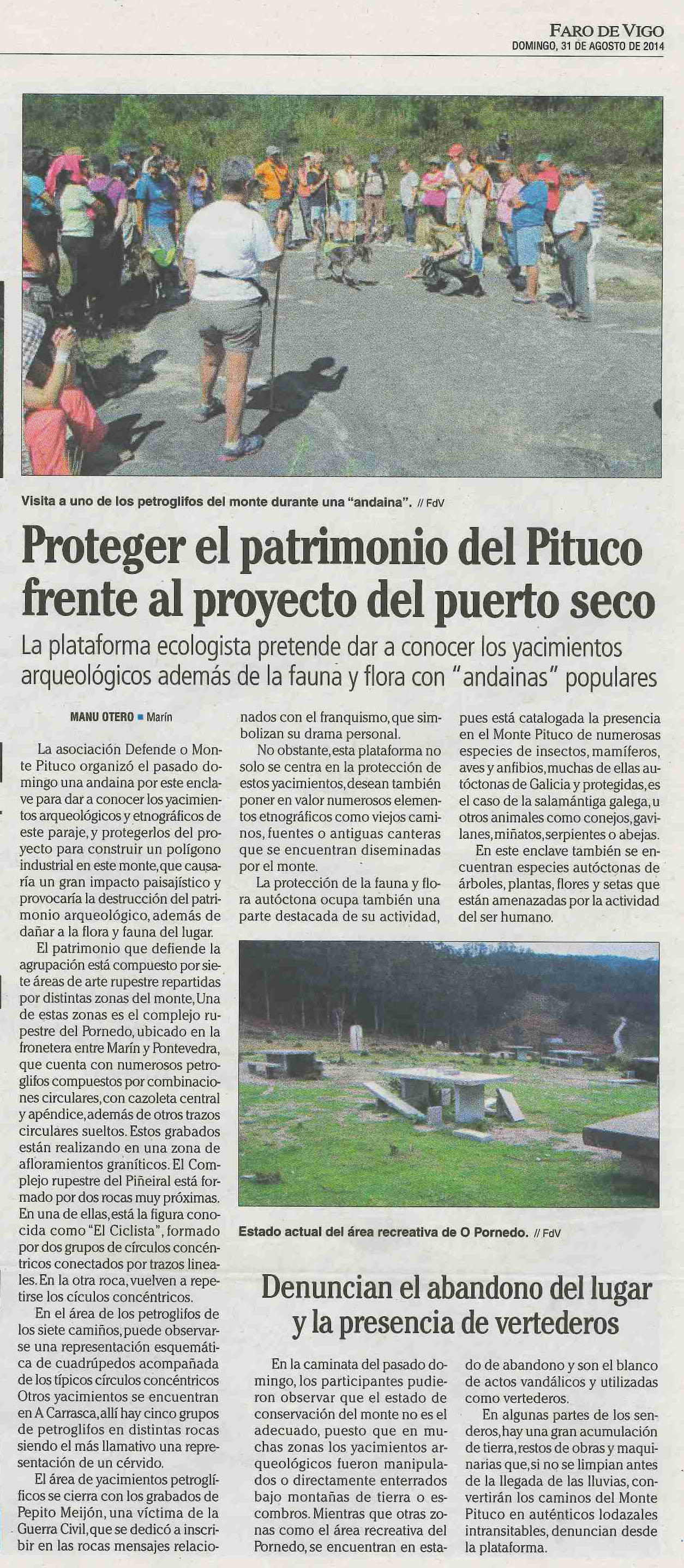 A partir da andaina organizada o pasado 24 de agosto -que terá continuidade cun novo roteiro a finais deste mes de setembro- o Faro de Vigo publicou unha reportaxe sobre tres dos aspectos -hai moitos máis argumentos!- nos que se fundamenta a defensa do Monte Pituco fronte ao proxecto da Xunta e do Concello de Marín -coa adhesión de varios colectivos interesados en servir determinados intereses político/económicos, ou simplemente en ‘pillar cacho’- de destrozar este Espazo Natural para convertelo nun polígono industrial.