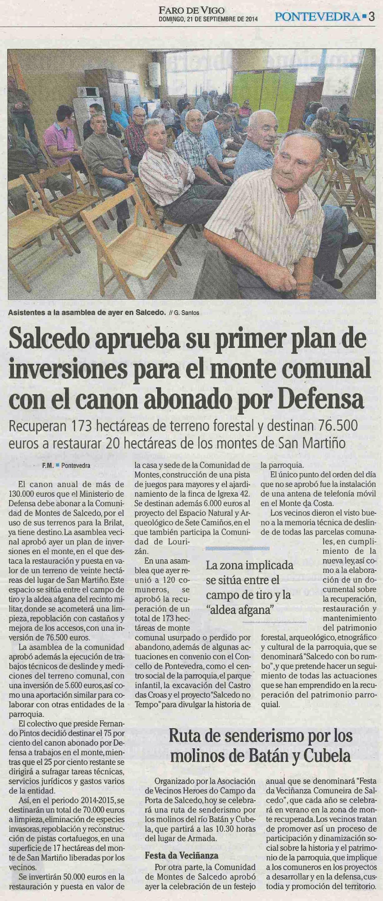 …Se destinan además 6.000 euros al proyecto del Espacio Natural y Arqueológico de Sete Camiños, en el que también participa la Comunidad de Lourizán…En una asamblea que ayer reunió a 120 comuneros, se aprobó la recuperación de un total de 173 hectáreas de monte comunal usurpado o perdido por abandono, además de algunas actuaciones en convenio con el Concello de Pontevedra, como el centro social de la parroquia, el parque infantil, la excavación del Castro das Croas y el proyecto “Salcedo no Tempo” para divulgar la historia de la parroquia.