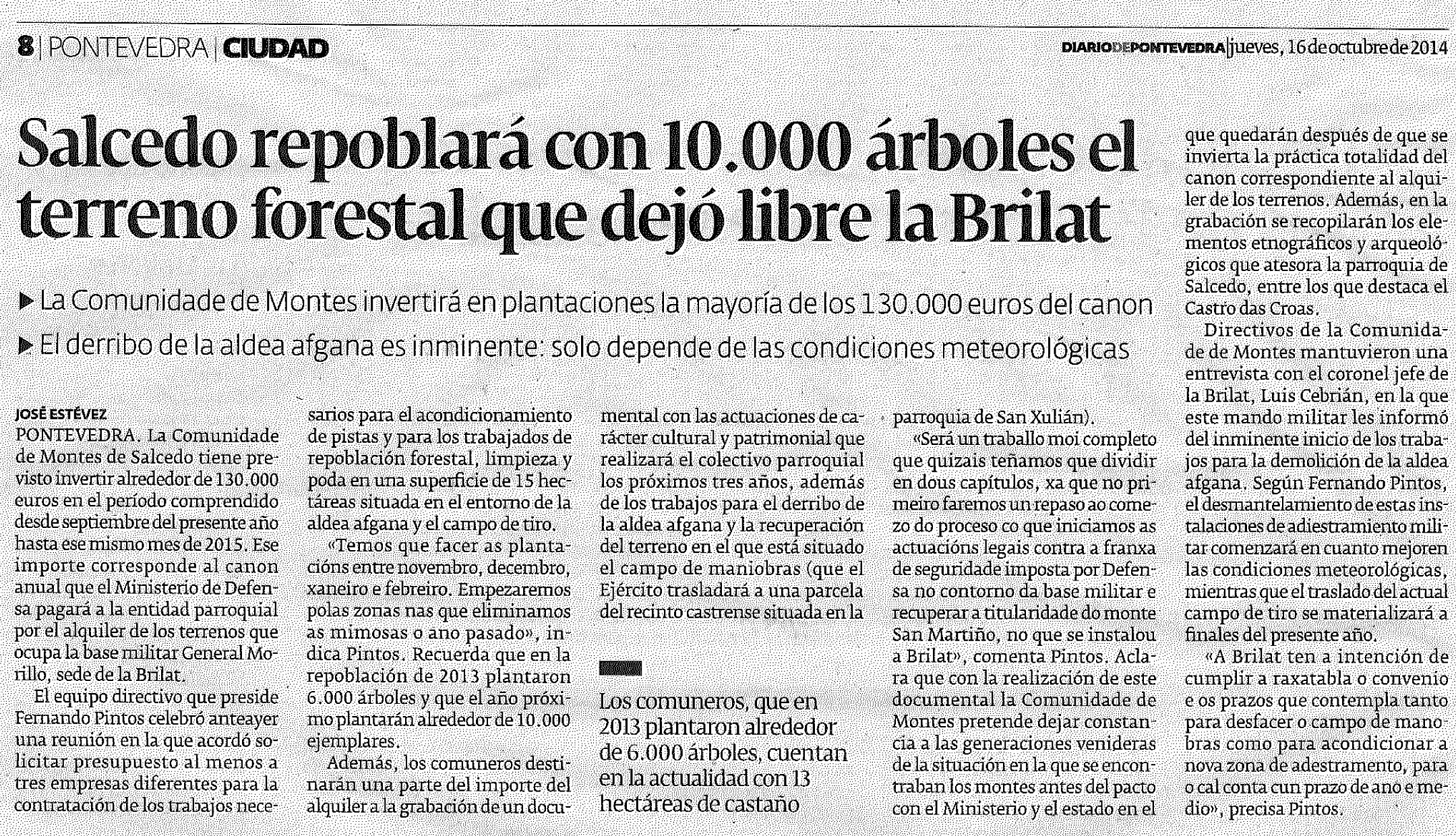 “Además, los comuneros destinarán una parte del importe del alquiler a la grabación de un documental con las actuaciones de carácter cultural y patrimonial que realizará el colectivo parroquial los próximos tres años, además de los trabajos para el derribo de la aldea afgana y la recuperación del terreno en el que está situado el campo de maniobras (que el Ejército trasladará a una parcela del recinto castrense situada en la parroquia de San Xulián).