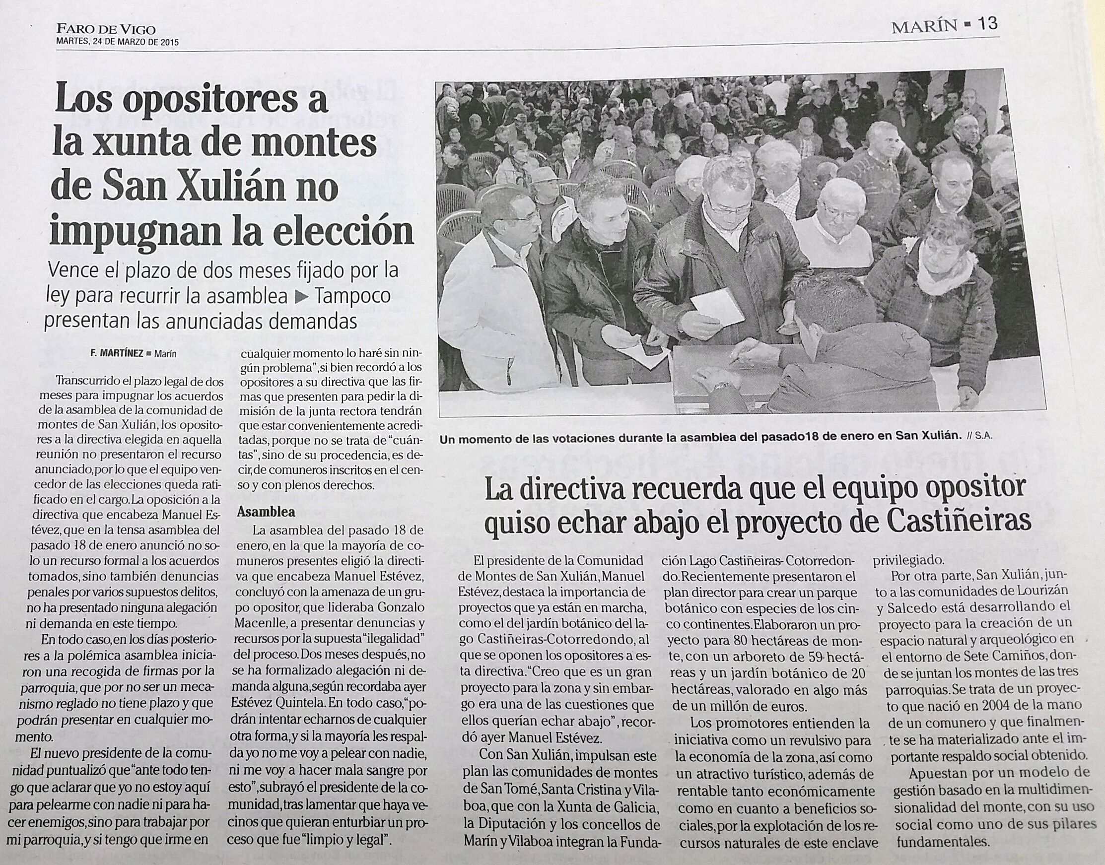 Transcurrido el plazo legal de dos meses para impugnar los acuerdos de la asamblea de la Comunidad de Montes de San Xulián, los opositores a la directiva elegida en aquella reunión NO PRESENTARON EL RECURSO ANUNCIADO, por lo que lo que el equipo vencedor de las elecciones queda ratificado en el cargo. La oposición de la directiva que encabeza Manuel Estévez, que en la tensa asamblea del pasado 18 de enero anunció no solo un recurso formal a los acuerdos tomados, sino también denuncias penales por varios supuestos delitos, NO HA PRESENTADO NINGUNA ALEGACIÓN NI DEMANDA en este tiempo.