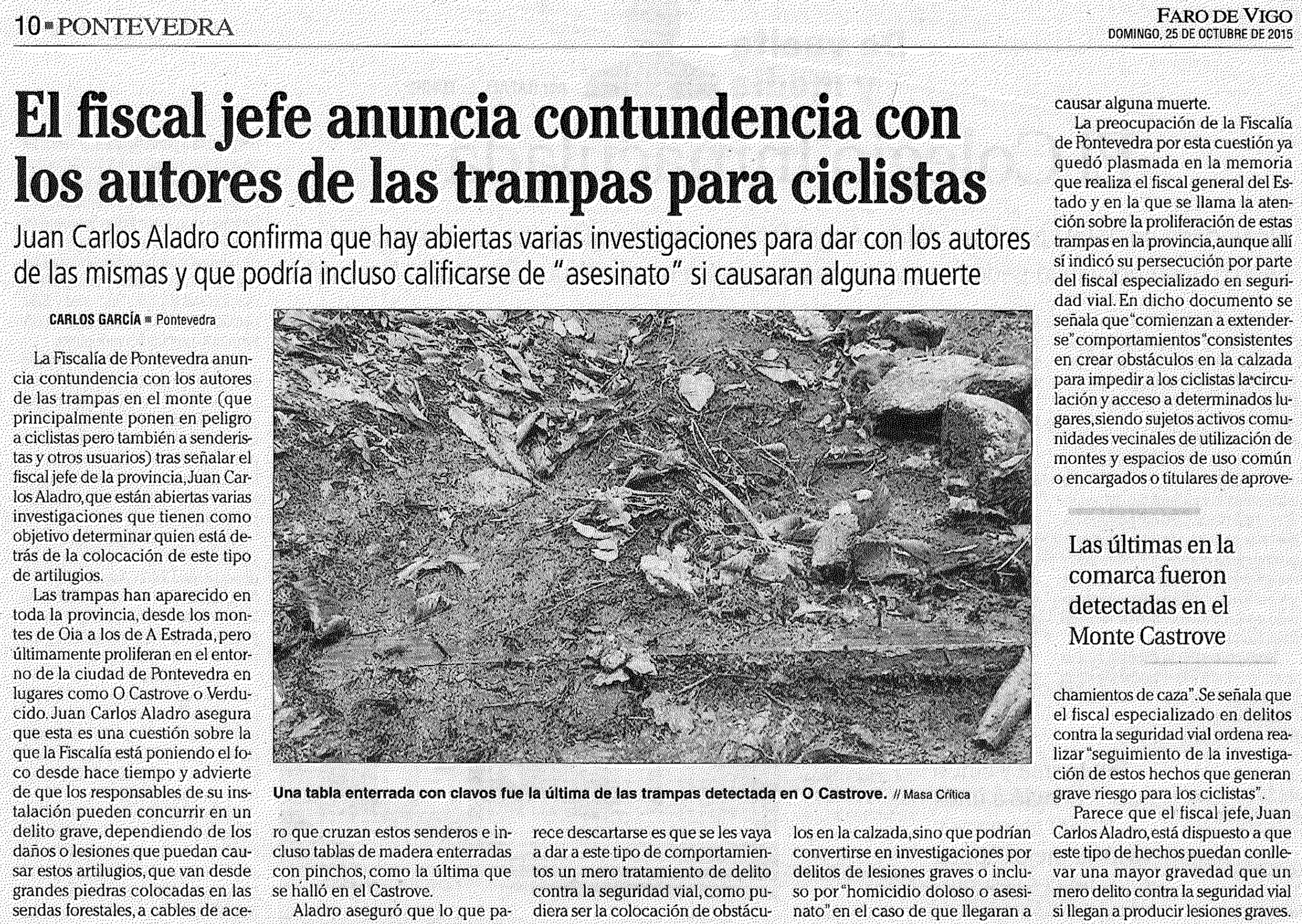 “Advirtió de que la colocación de estos obstáculos, en determinados casos concretos, podría derivar en imputaciones de delitos vinculados con el homicidio doloso o, incluso, el asesinato, ya fuera en grado de tentativa o consumado según se desprendiese de las pruebas recabadas. La intención es erradicar una práctica que, según pone de manifiesto la memoria de la Fiscalía General del Estado, ha ido extendiéndose paulatinamente en Pontevedra a lo largo del pasado año”.