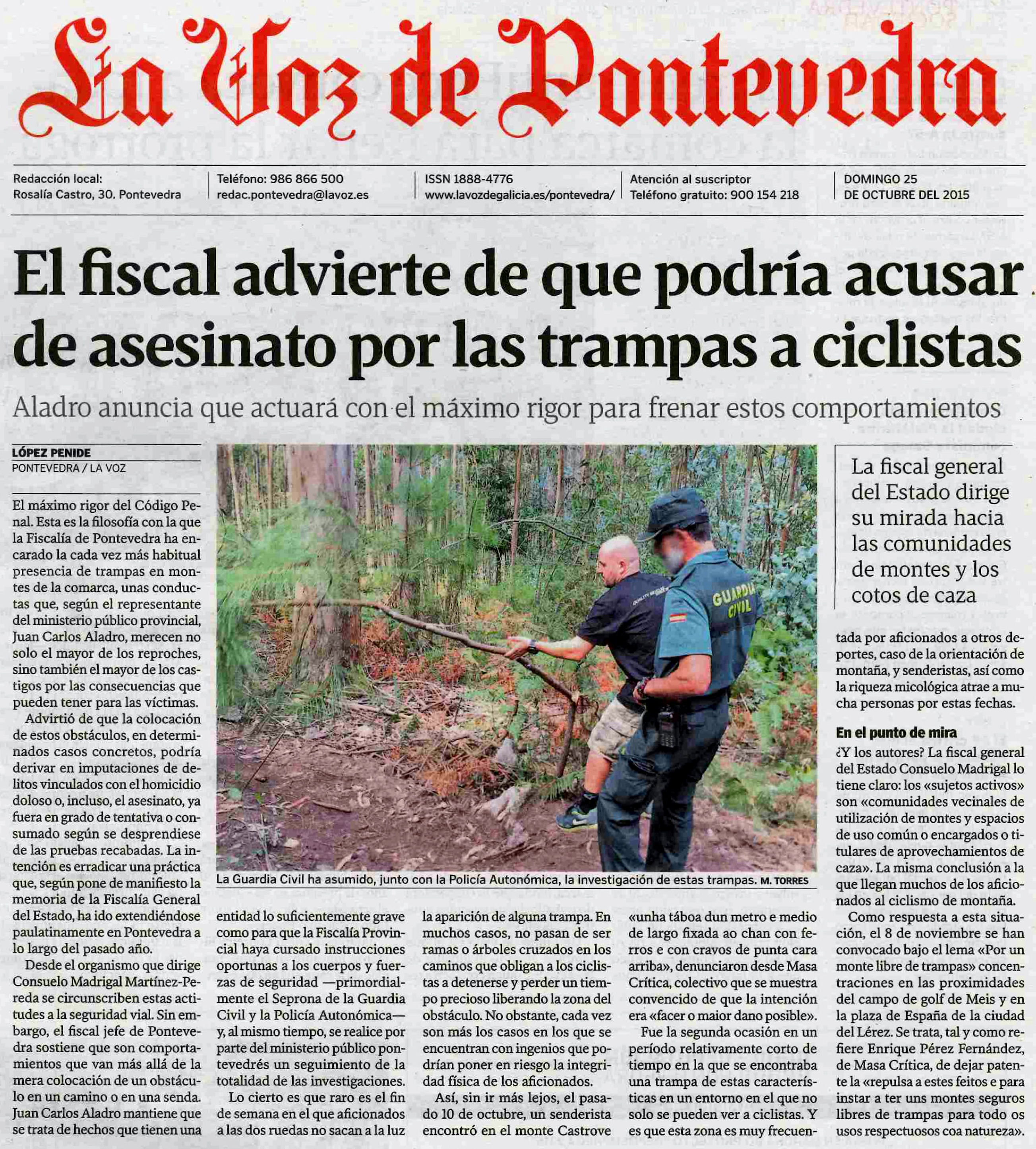 “Las trampas han aparecido en toda la provincia, desde los montes de Oia a los de A Estrada, pero últimamente proliferan en el entorno de la ciudad de Pontevedra en lugares como O Castrove o Verducido. Juan Carlos Aladro asegura que esta es una cuestión sobre la que la Fiscalía está poniendo el foco desde hace tiempo y advierte de que los responsables de su instalación pueden concurrir en un delito grave, dependiendo de los daños o lesiones que puedan causar estos artilugios, que van desde grandes piedras colocadas en las sendas forestales, a cables de acero que cruzan estos senderos e incluso tablas de madera enterradas con pinchos, como la última que se halló en el Castrove”.