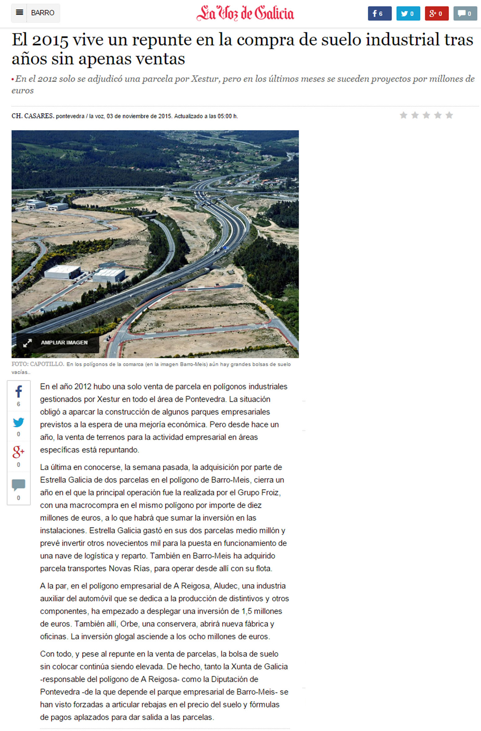 “Con todo, y pese al repunte en la venta de parcelas, la bolsa de suelo sin colocar continúa siendo elevada. De hecho, tanto la Xunta de Galicia -responsable del polígono de A Reigosa- como la Diputación de Pontevedra -de la que depende el parque empresarial de Barro-Meis- se han visto forzadas a articular rebajas en el precio del suelo y fórmulas de pagos aplazados para dar salida a las parcelas”.