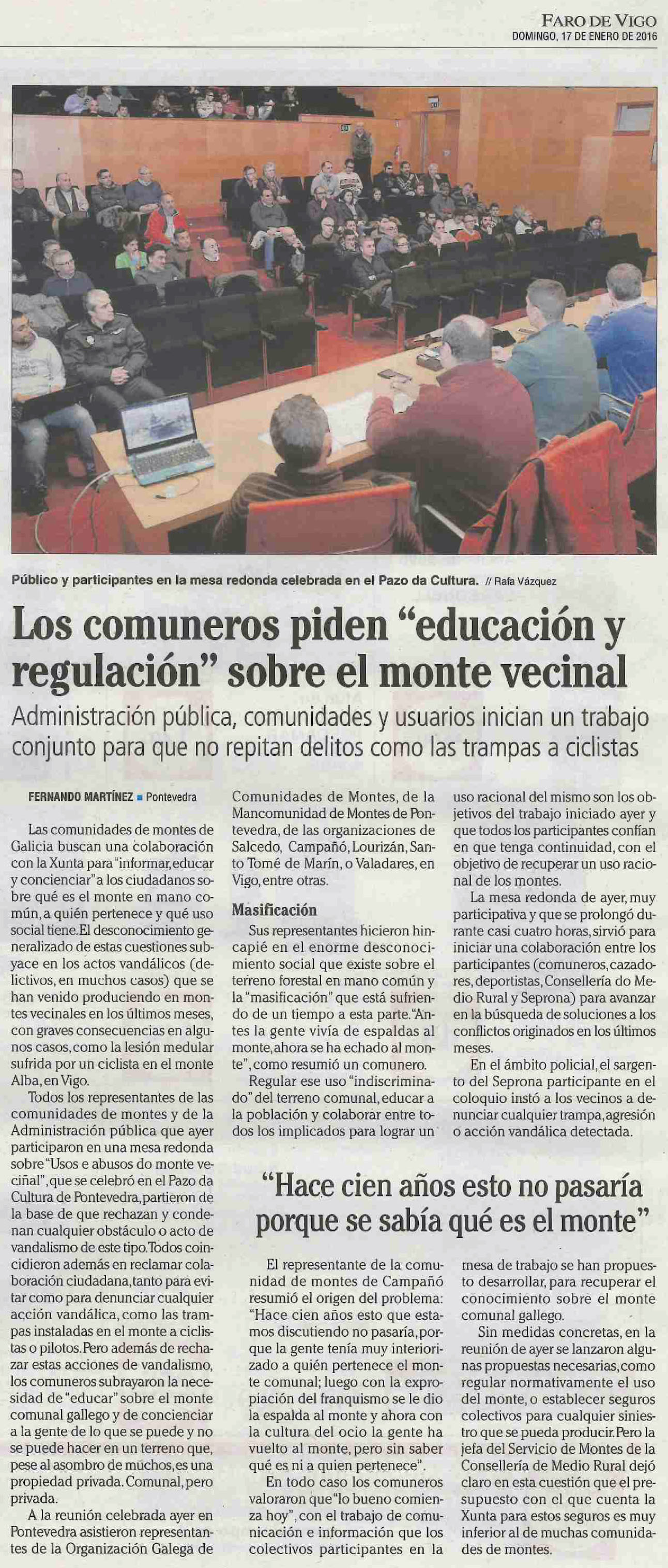 O presidente da asociación de ciclistas Pedaladas, Manuel Torres; o presidente da Federación de Caza de Pontevedra, Francisco Couselo; o sarxento do Seprona José Luis de la Fuente; a xefa de Montes, Amalia Pazos; o avogado Calixto Escariz; e o presidente da Mancomunidade de Montes de Pontevedra, Carlos Morgade. Foron os seis compoñentes da mesa redonda titulada “Usos e abusos do monte veciñal”, organizada pola Mancomunidade para abordar a problemática xerada a raíz da aparición de perigosas trampas nos montes. Trampas como a que provocou a morte dun ciclista en Cantabria, a lesión medular que padece outro afeccionado por un grave percance no monte Alba de Vigo e os sustos -coas súas respectivas denuncias- que levan numerosos deportistas percorrendo os montes da contorna de Pontevedra.