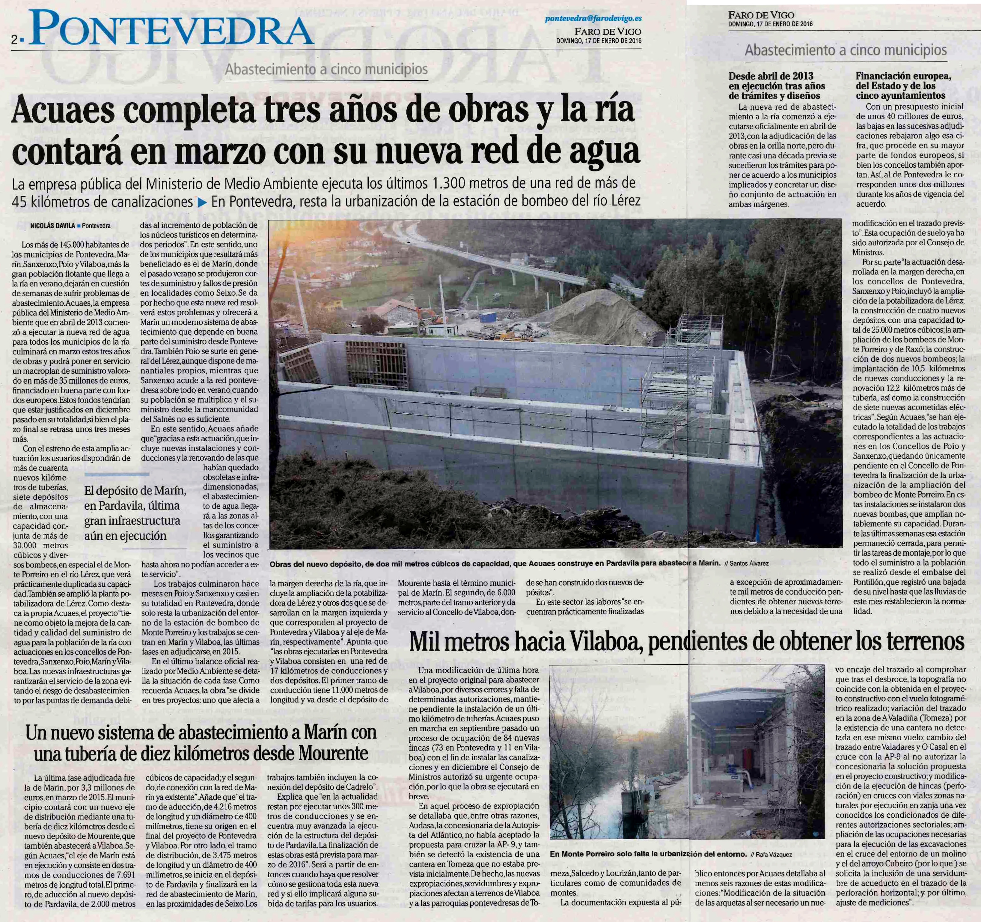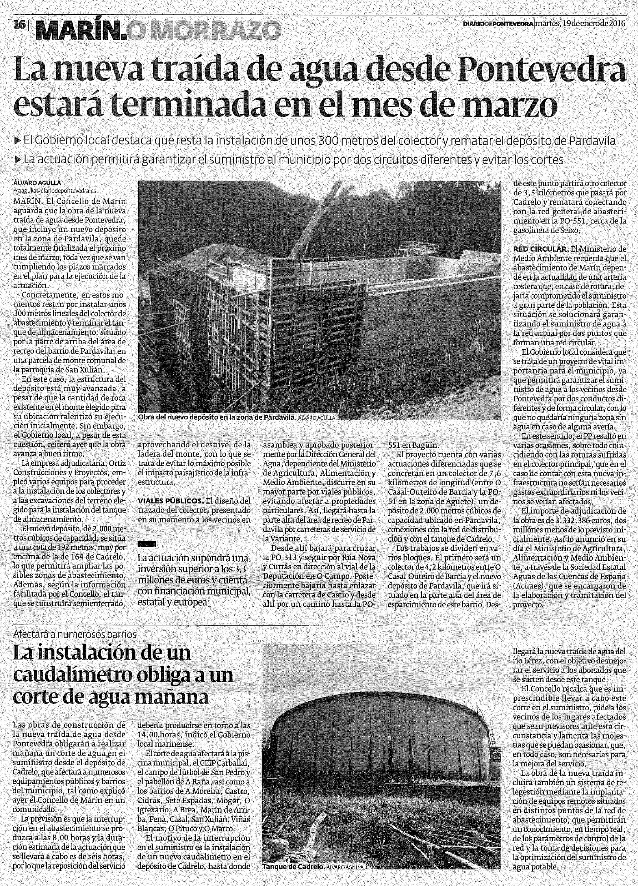 “En la actualidad restan por ejecutar unos 300 metros de conducciones y se encuentramuy avanzada la ejecución de la estructura del depósito de Pardavila. La finalización de estas obras está prevista para marzo de 2016”.