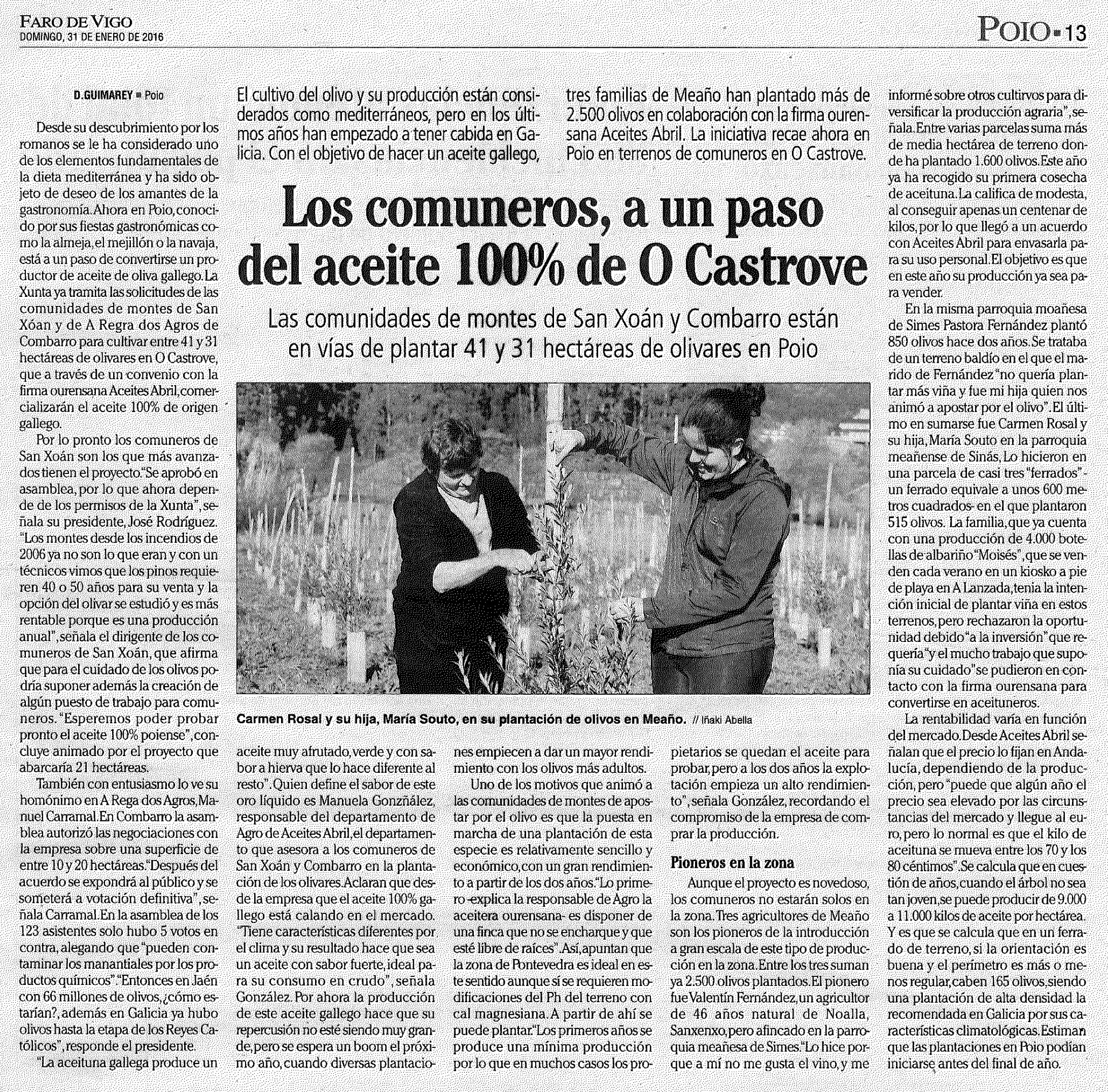 “La Xunta ya tramita las solicitudes de las comunidades de montes de San Xóan y de A Regra dos Agros de Combarro para cultivar entre 41 y 31 hectáreas de olivares en O Castrove, que a través de un convenio con la firma ourensana Aceites Abril, comercializarán el aceite 100% de origen gallego. Por lo pronto los comuneros de San Xoán son los que más avanzados tienen el proyecto. “Se aprobó en asamblea, por lo que ahora depende de los permisos de la Xunta”, señala su presidente, José Rodríguez. “Los montes desde los incendios de 2006 ya no son lo que eran y con un técnicos vimos que los pinos requieren 40 o 50 años para su venta y la opción del olivar se estudió y es más rentable porque es una producción anual” (…) También con entusiasmo lo ve su homónimo en A Rega dos Agros, Manuel Carramal. En Combarro la asamblea autorizó las negociaciones con la empresa sobre una superficie de entre 10 y 20 hectáreas. “Después del acuerdo se expondrá al público y se someterá a votación definitiva”.