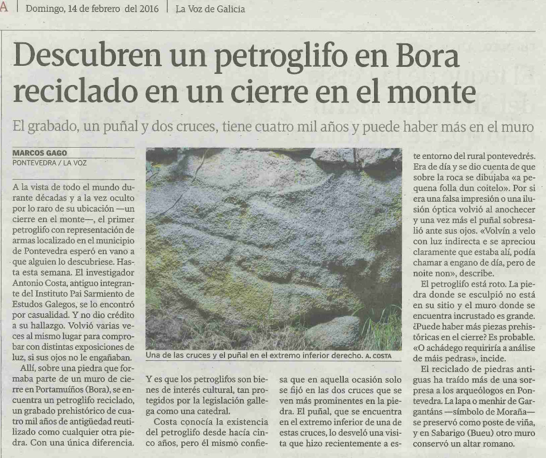 “Costa conocía la existencia del petroglifo desde hacía cinco años, pero él mismo confiesa que en aquella ocasión solo se fijó en las dos cruces que se ven más prominentes en la piedra. El puñal, que se encuentra en el extremo inferior de una de estas cruces, lo desveló una visita que hizo recientemente a este entorno del rural pontevedrés. Era de día y se dio cuenta de que sobre la roca se dibujaba «a pequena folla dun coitelo». Por si era una falsa impresión o una ilusión óptica volvió al anochecer y una vez más el puñal sobresalió ante sus ojos. «Volvín a velo con luz indirecta e se apreciou claramente que estaba alí, podía chamar a engano de día, pero de noite non», describe”.