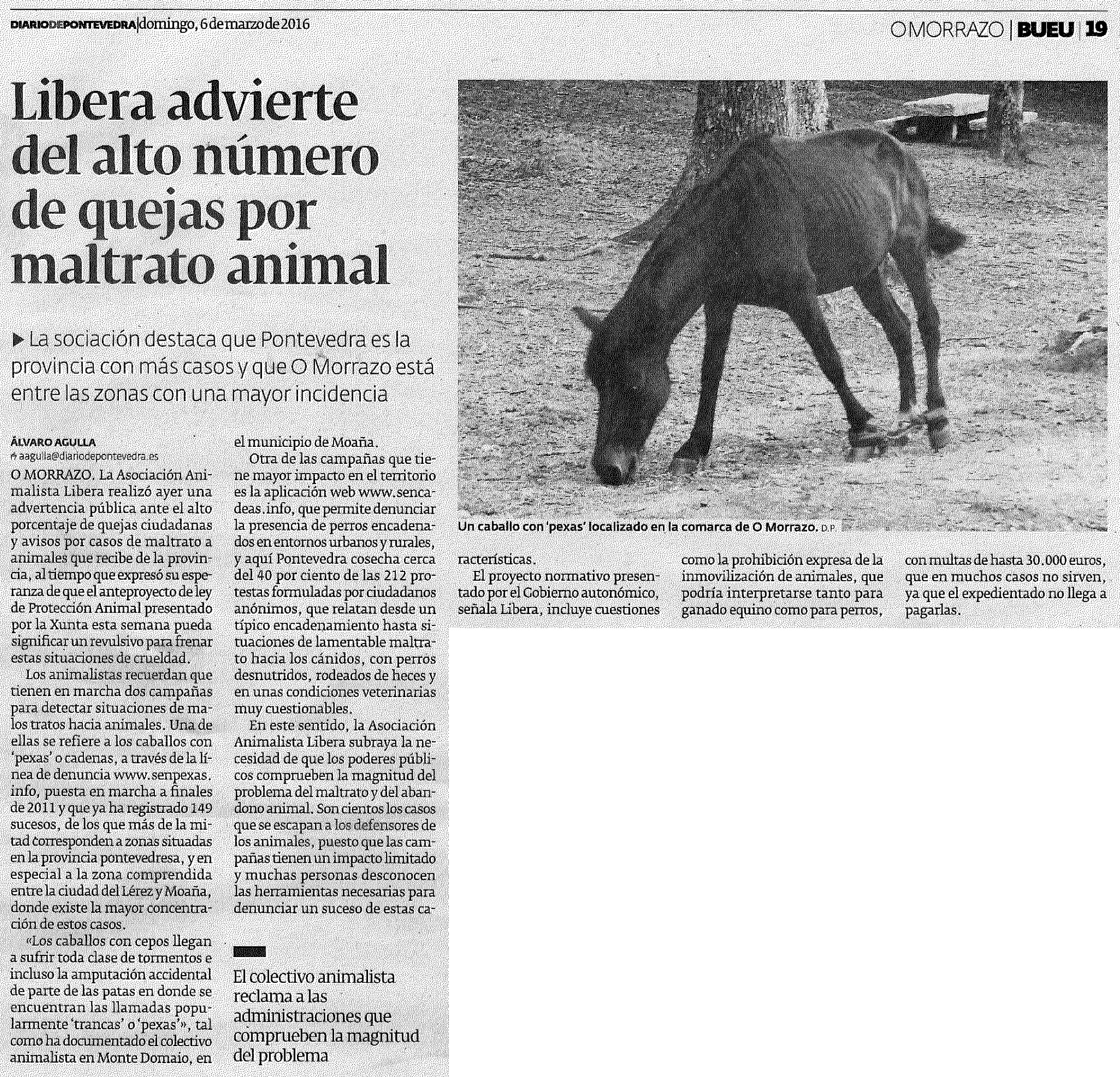 “…Los animalistas recuerdan que tienen en marcha dos campañas para detectar situaciones de malos tratos hacia animales. Una de ellas se refiere a los caballos con pexas o cadenas, a través de la línea de denuncia www.senpexas.info, puesta en marcha a finales de 2011 y que ya ha registrado 149 sucesos, de los que más de la mitad corresponden a zonas situadas en la provincia pontevedresa, y en especial a la zona comprendida entre la ciudad del Lérez y Moaña, donde existe la mayor concentración de estos casos…”