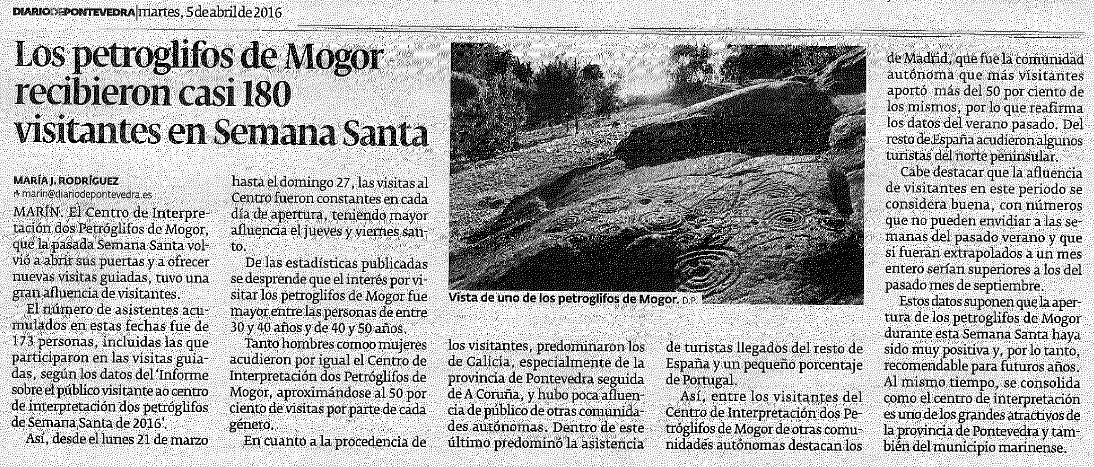 …Para tan pírrico balance de visitas ao Centro de Interpretación dos Petroglifos de Mogor en toda a Semana Santa, máis lle valía ao Concello de Marín optar pola discreción en vez de facer un barullo mediático innecesario e mesmo contraproducente, en tanto deixa en mal lugar a xestión das Concellerías de Cultura e de Turismo.