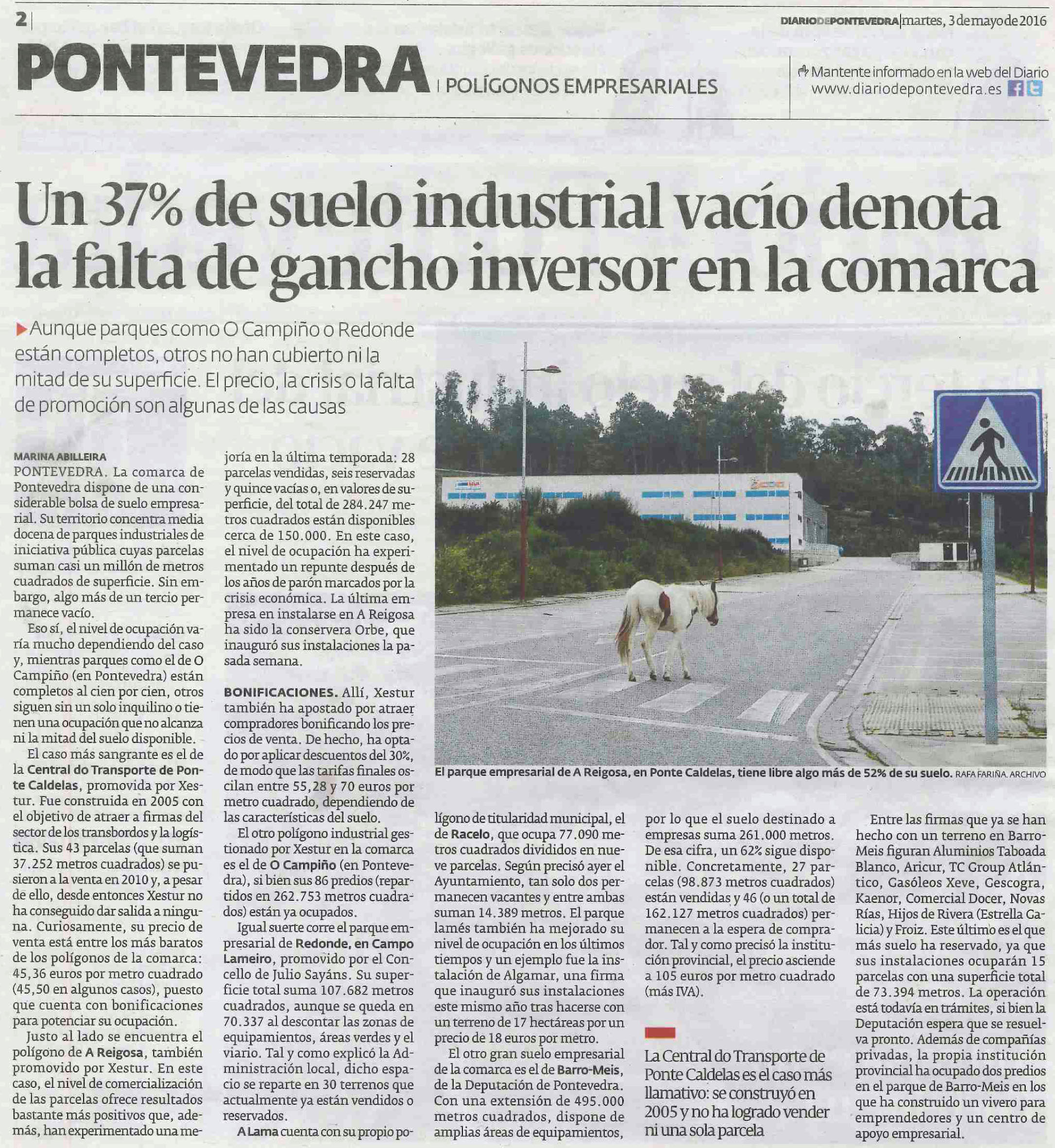 El caso más sangrante es el de la Central do Transporte de Ponte Caldelas, promovida por Xestur. Fue construida en 2005 con el objetivo de atraer a firmas del sector de los transbordos y la logística. Sus 43 parcelas (que suman 37.252 metros cuadrados) se pusieron a la venta en 2010 y, a pesar de ello, desde entonces Xestur no ha conseguido dar salida a ninguna. Curiosamente, su precio de venta está entre los más baratos de los polígonos de la comarca: 45,36 euros por metro cuadrado (45,50 en algunos casos), puesto que cuenta con bonificaciones para potenciar su ocupación.