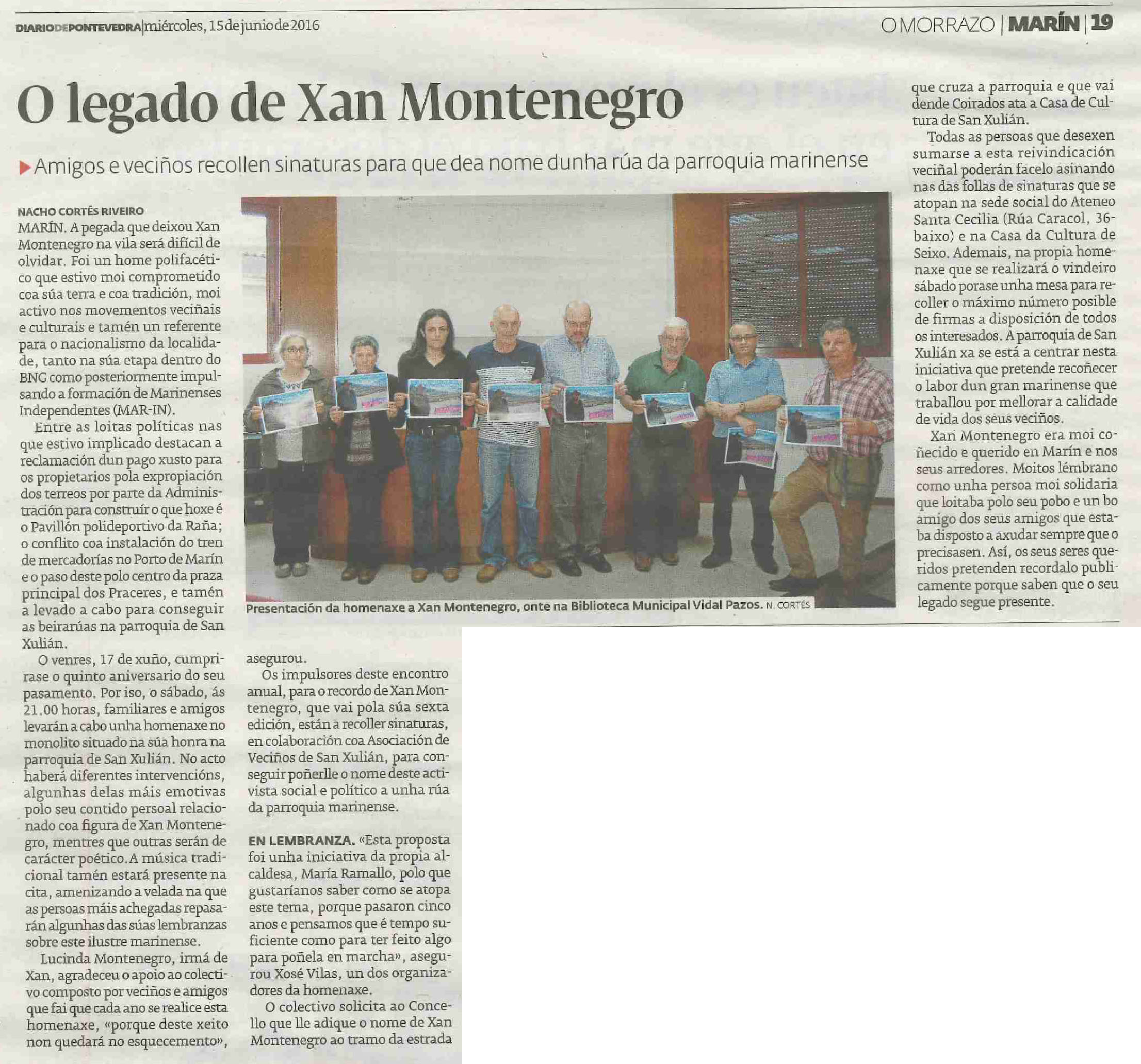 Máis de 70 persoas reuníronse neste encontro afectuoso, que tamén serviu para escenificar a campaña de recollida de sinaturas a prol de que se lle poña o nome de Xan Montenegro á estrada de San Xulián, que el contribuiu -de xeito intenso e decisivo, diante das Administracións- a humanizar, coa construcción dunhas beirarrúas polas que a veciñanza poida camiñar máis segura. No domicilio familiar de Xan Montenegro, na Casa da Cultura de Seixo e no Ateneo Santa Cecilia de Marín atópanse tamén copias destes impresos para que quen o desexe poida sumarse a esta iniciativa. Unha iniciativa que tamén tomará forma de moción ao Pleno do Concello, para que se debata nunha próxima sesión da Corporación Municipal de Marín.