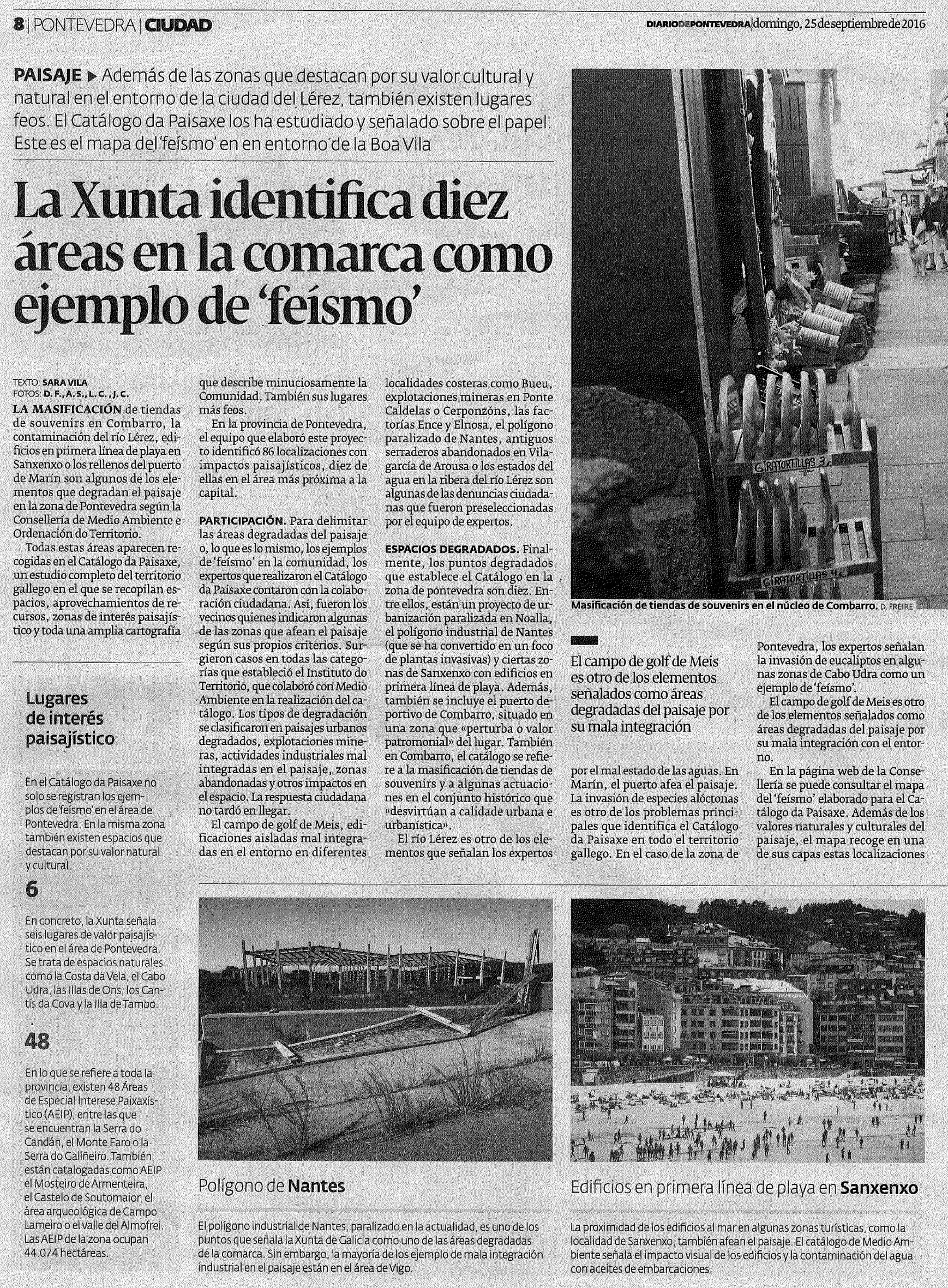 “El campo de golf de Meis, edificaciones aisladas mal integradas en el entorno de diferentes localidades costeras como Bueu, explotaciones mineras en Ponte Caldelas o Cerponzóns, las factorías de Ence y Elnosa, el polígono paralizado de Nantes, antigios serraderos abandonados en Vilagarcía de Arousa o los estados del agua en la ribera del río Lérez son algunas de las denuncias ciudadanas que fueron preseleccionadas por el equipo de expertos”.