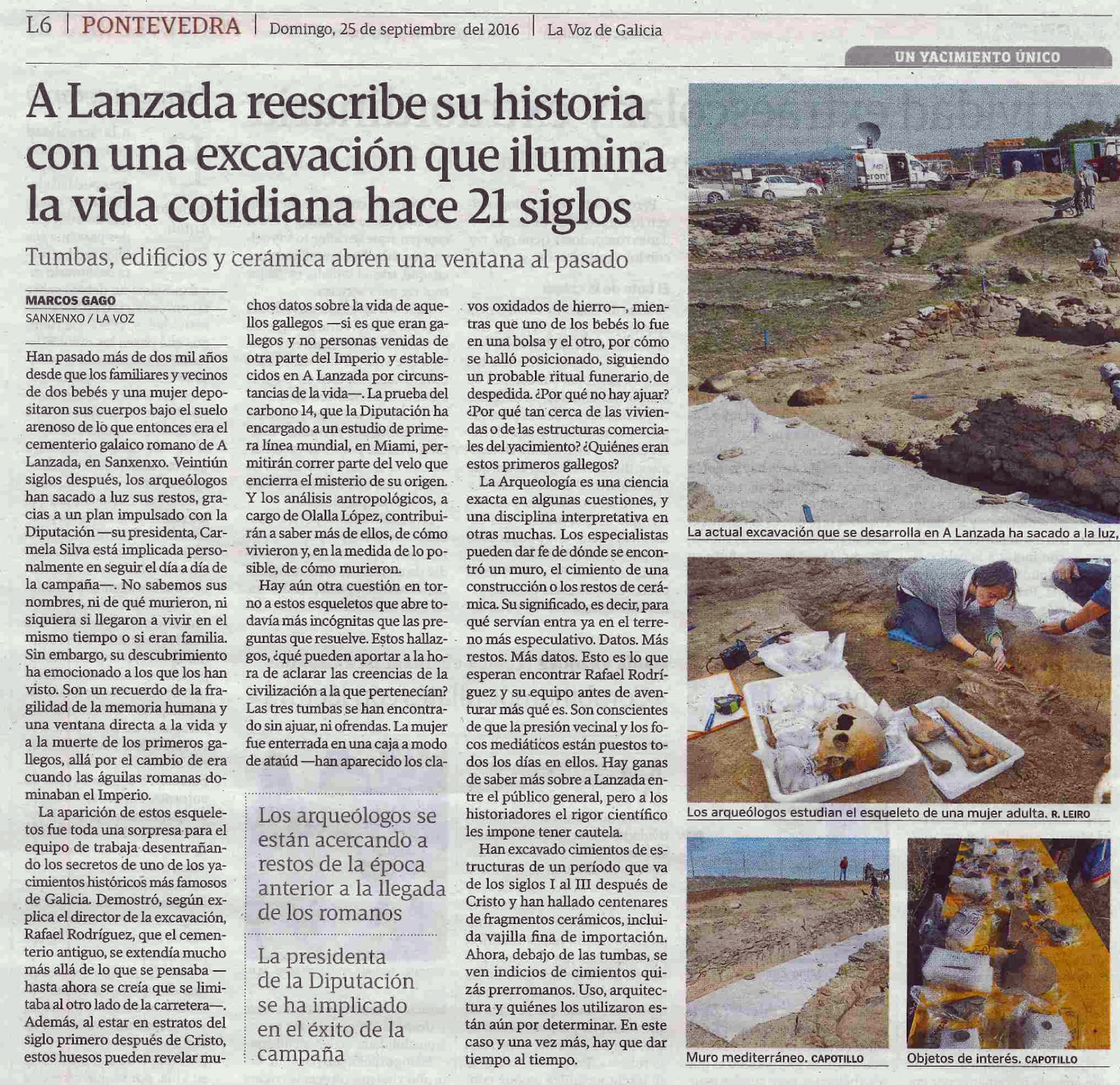 “La aparición de estos esqueletos fue toda una sorpresa para el equipo de trabaja desentrañando los secretos de uno de los yacimientos históricos más famosos de Galicia. Demostró, según explica el director de la excavación, Rafael Rodríguez, que el cementerio antiguo, se extendía mucho más allá de lo que se pensaba -hasta ahora se creía que se limitaba al otro lado de la carretera-. Además, al estar en estratos del siglo primero después de Cristo, estos huesos pueden revelar muchos datos sobre la vida de aquellos gallegos -si es que eran gallegos y no personas venidas de otra parte del Imperio y establecidos en A Lanzada por circunstancias de la vida-. La prueba del carbono 14, que la Diputación ha encargado a un estudio de primera línea mundial, en Miami, permitirán correr parte del velo que encierra el misterio de su origen. Y los análisis antropológicos, a cargo de Olalla López, contribuirán a saber más de ellos, de cómo vivieron y, en la medida de lo posible, de cómo murieron”.