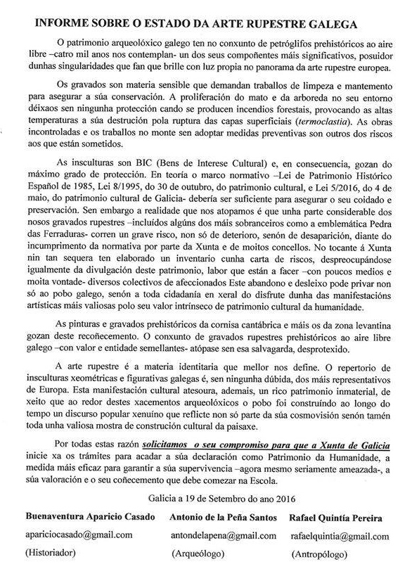 Pasou un mes dende que tres profesionais da Historia, da Arqueoloxía e da Antropoloxía -Buenaventura Aparicio, Antonio de la Peña e Rafa Quintía, por esa orde- asinaron un “Informe sobre o Estado da Arte Rupestre Galega”. Ese documento trascendeu xa aos medios de comunicación, ás redes sociais e a numerosos colectivos e persoas sensibles coa precaria situación da inmensa maioría dos petroglifos que atesoura a nosa terra.