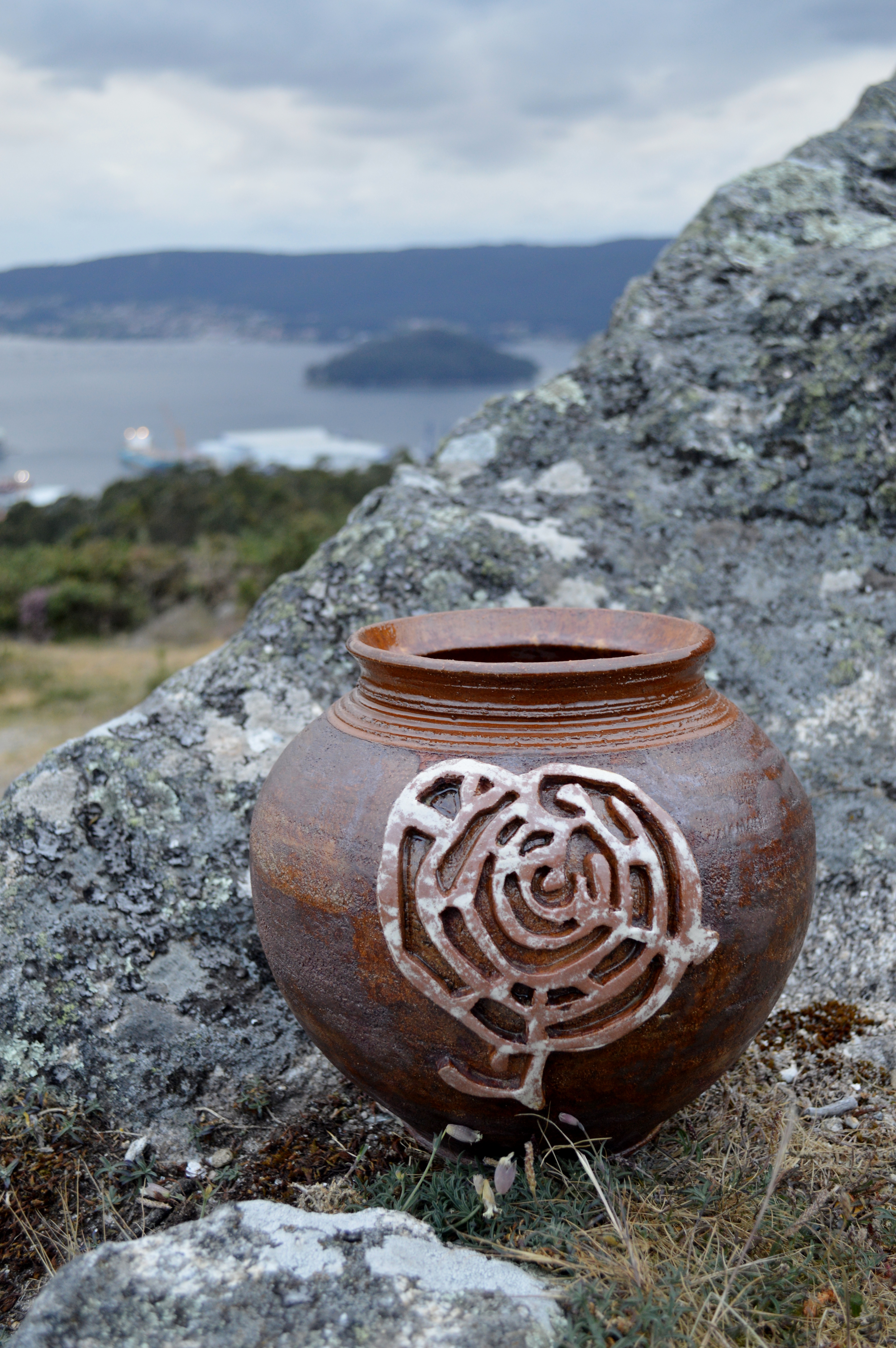Laura Villanueva, de Alén das Olas, realizando unha peza cun calco do petróglifo do Pornedo