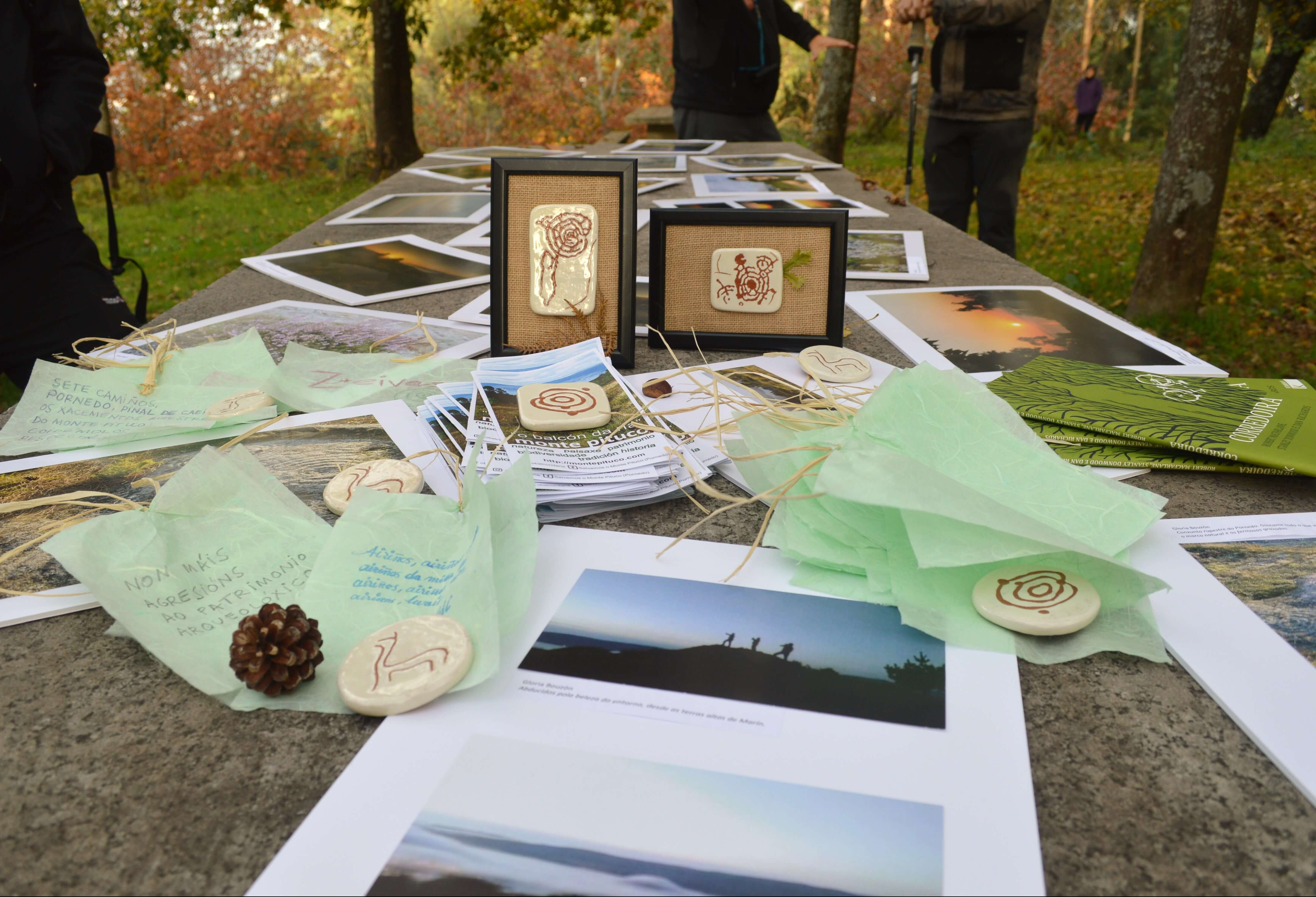 As pezas cerámicas obsequiadas, coas fotografías presentadas, no inicio da ruta polo Monte Pornedo.