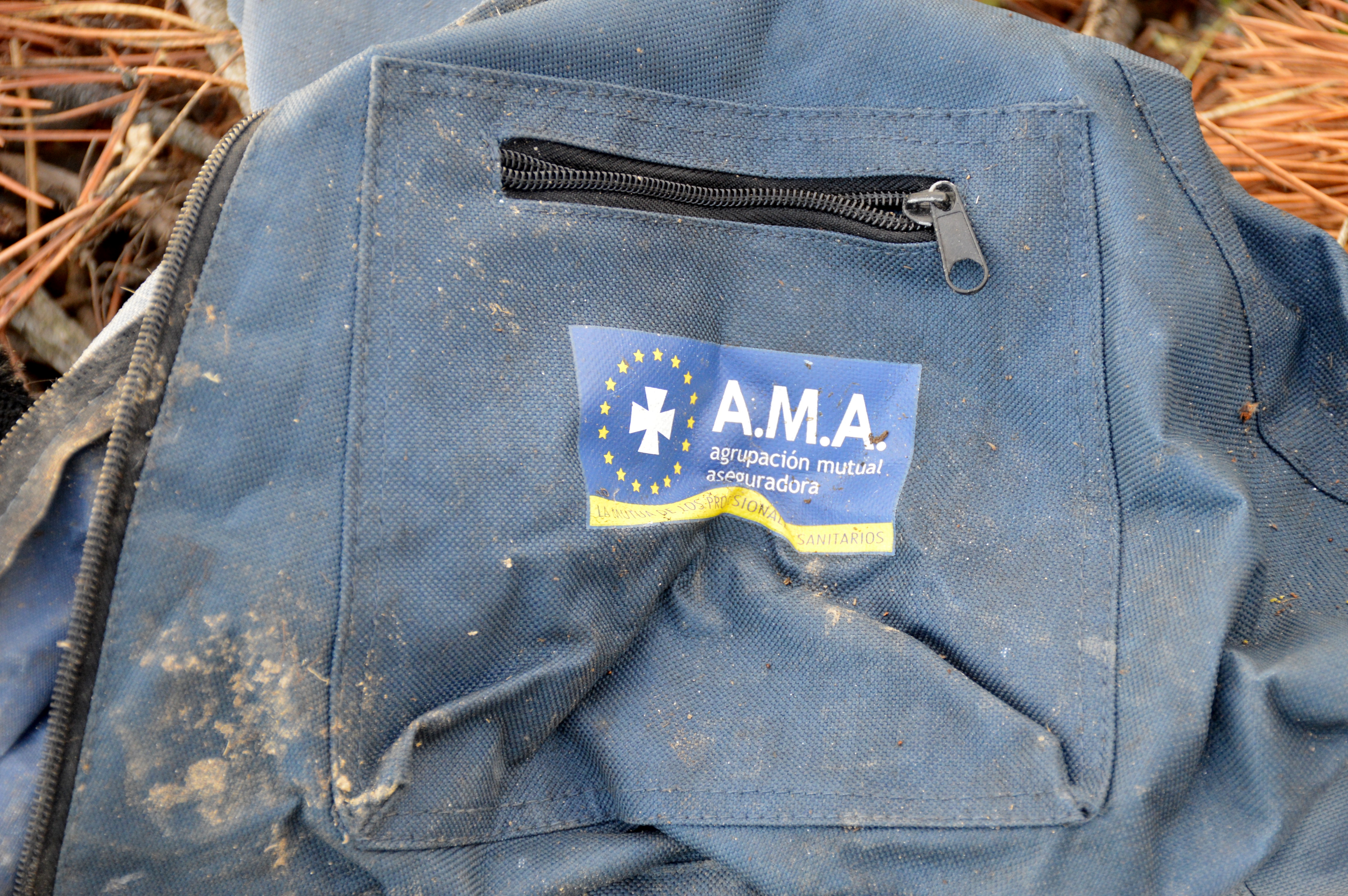 Unha mochila vella con publicidade dunha aseguradora