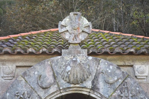 Detalle do arco na porta de acceso, coa cuncha e a cruz na parte central