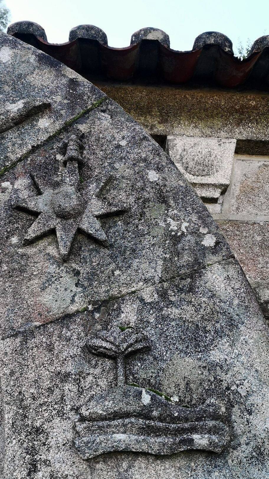 Detalle do arco na porta de acceso: rosa dos ventos e balea
