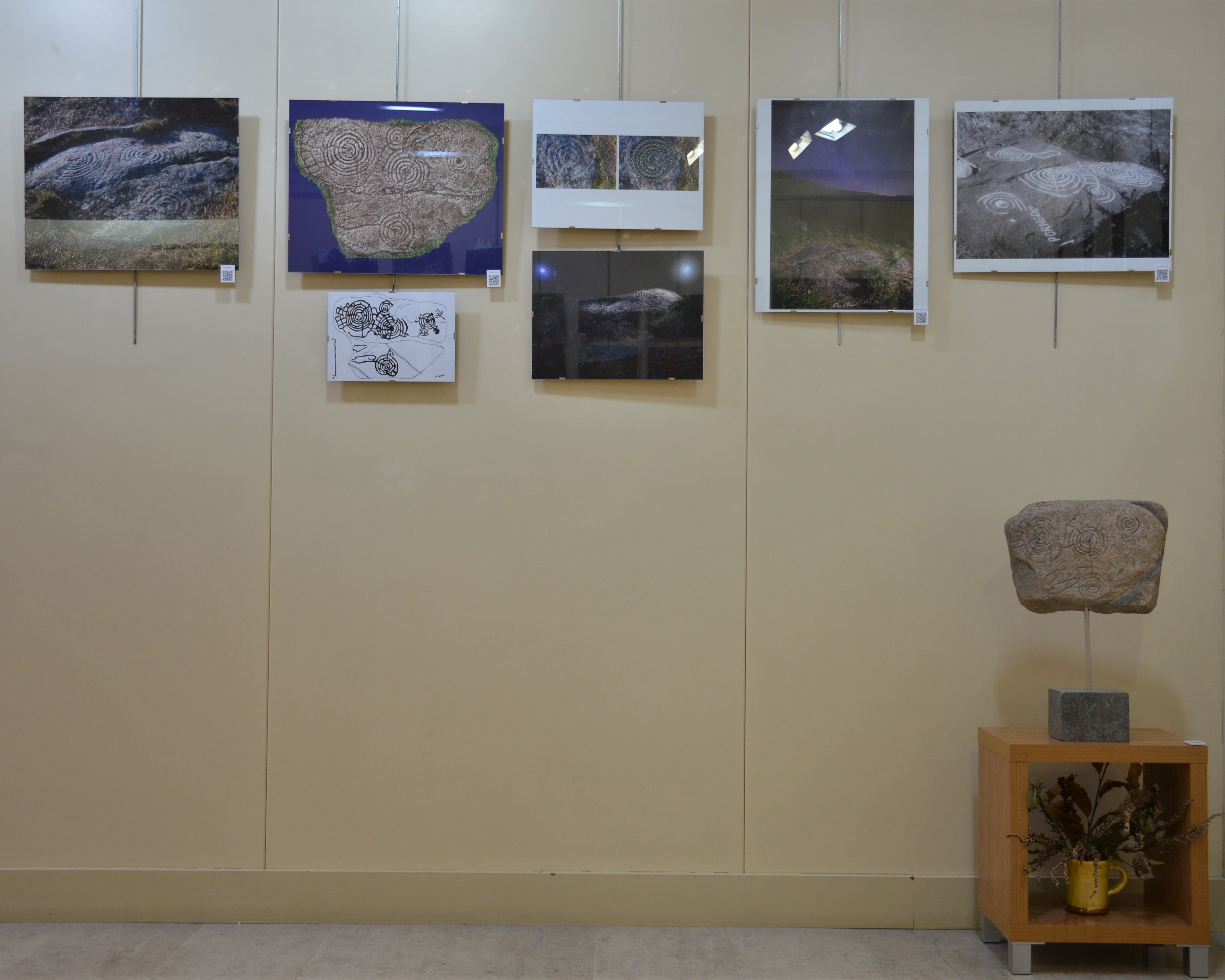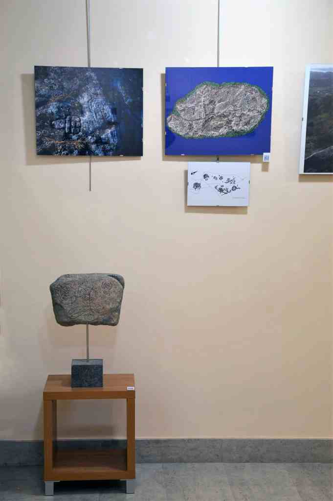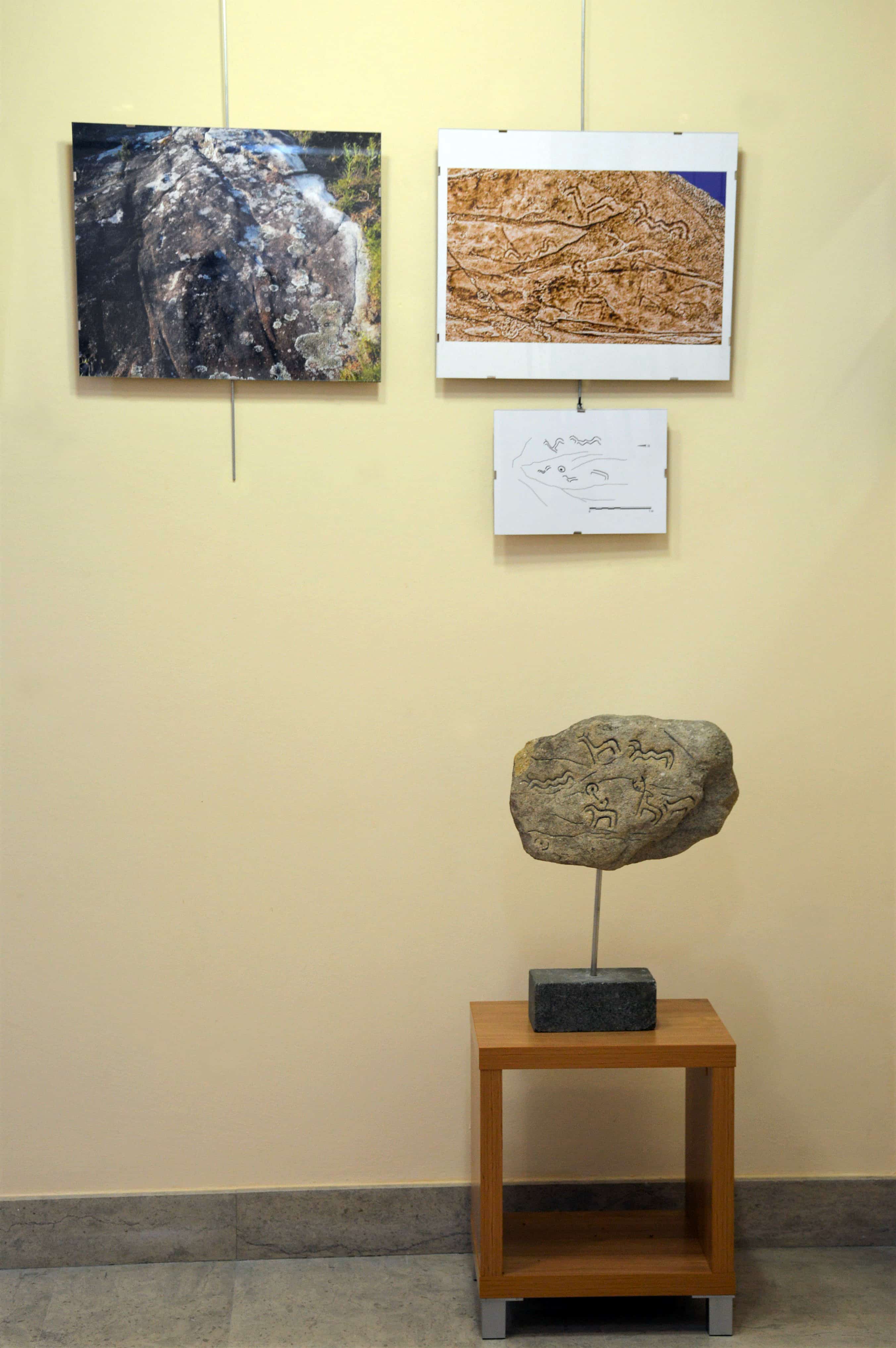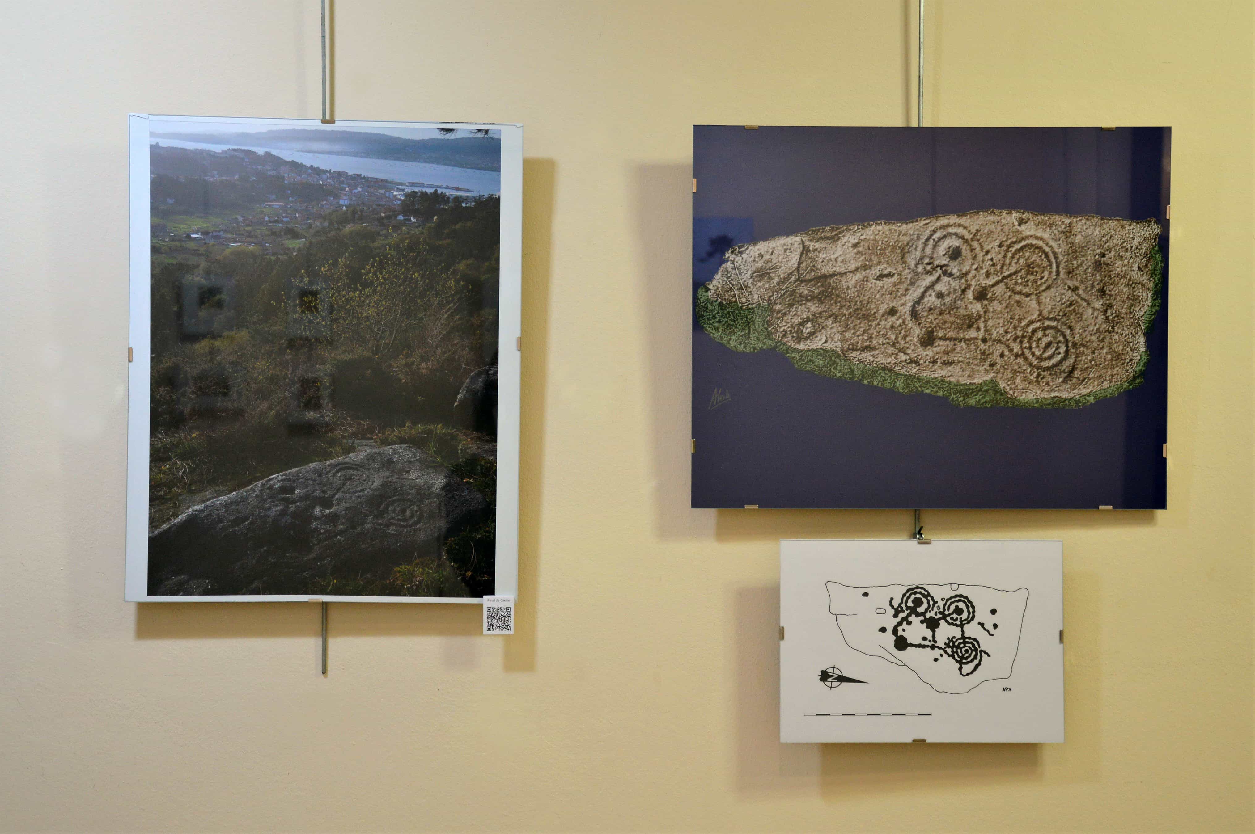 Distintas representacións do petróglifo do Pornedo: o calco de Antonio de la Peña, a reconstitución dixital 3D realizada por Antonio Costa, a fotografía nocturna de Fran Currás coa Vía Láctea sobre este gravado rupestre e a fotografía tomada polo mestre Carlos Paratcha probablemente cando se descubriu este xacemento arqueolóxico. A escultura é unha reprodución en miniatura do artesán Francisco Ameixeiras.