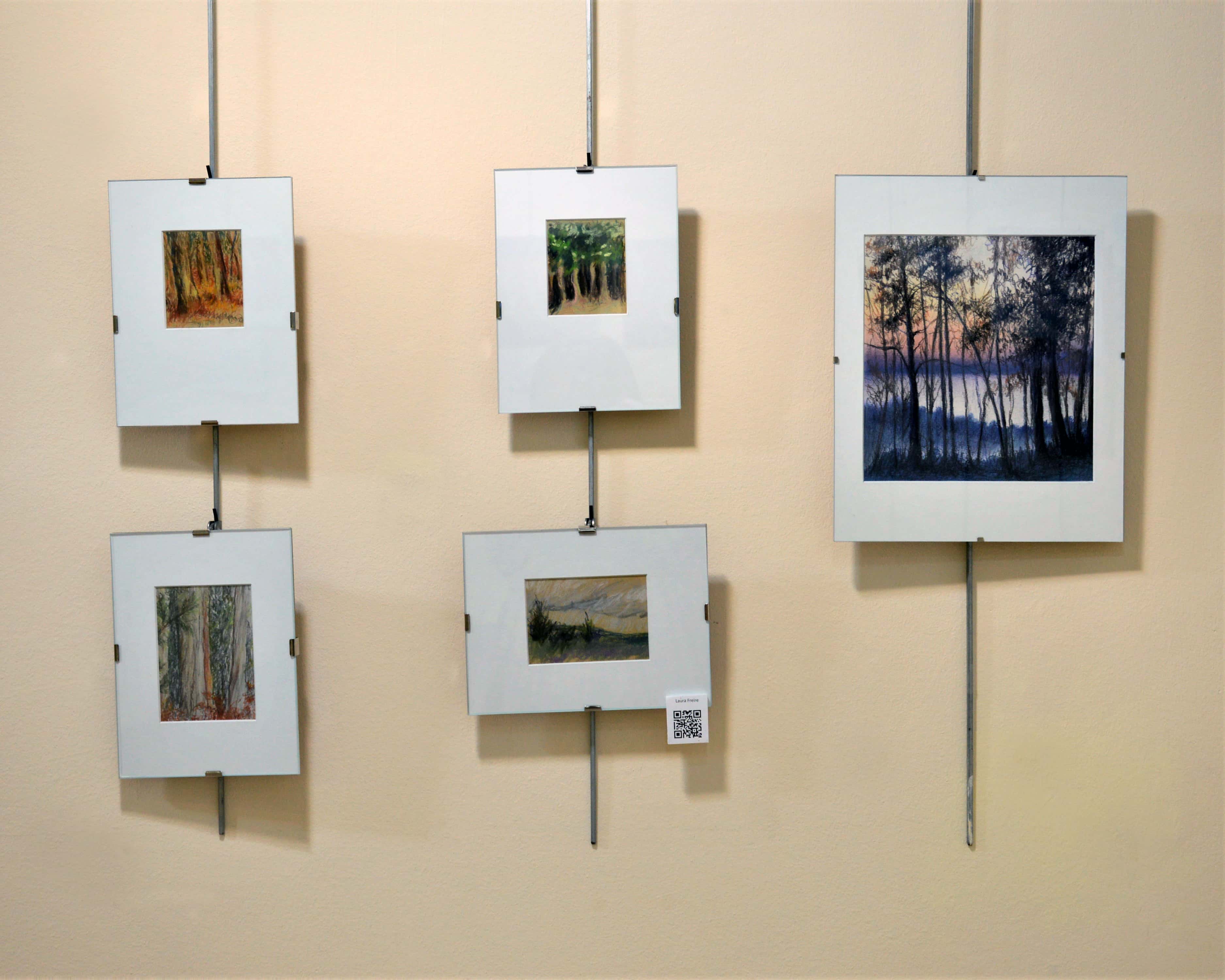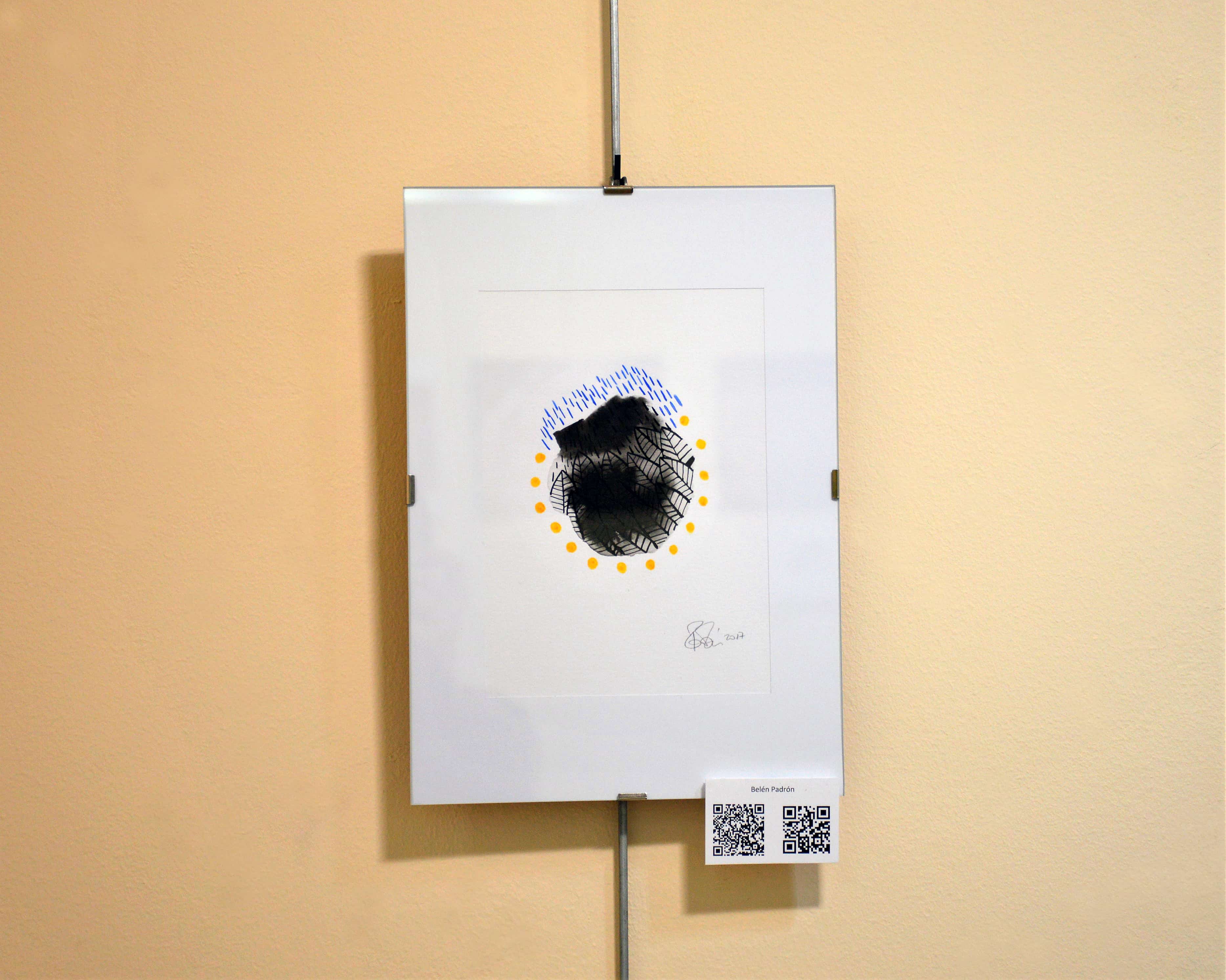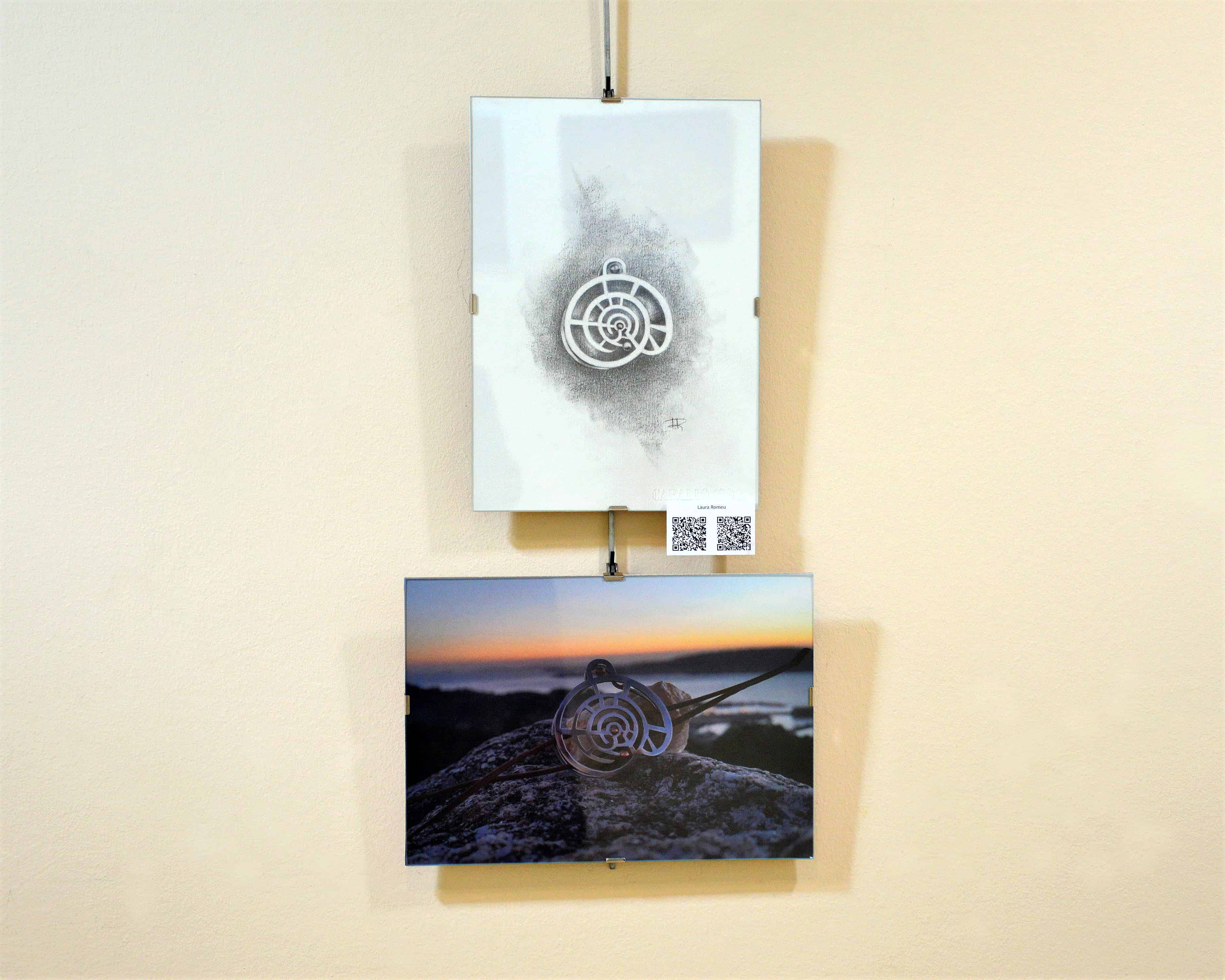 Panel dedicado ás creacións artísticas inspiradas na natureza, na paisaxe e no patrimonio do ‘balcón da ría’: ilustración dunha illa, de Belén Padrón; unha peza da serie Pintura no lugar, de Juan Rivas; unha xoia deseñada por Laura Romeu a partir dos petróglifos do Pornedo e elaborada en prata e cobre; e a serie “Retrados do monte”, de Laura Freire, coa técnica do pastel.