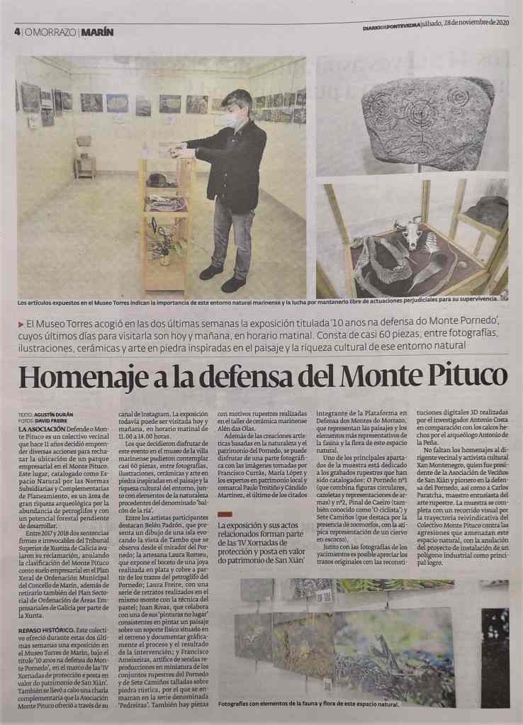 O Museo Torres acolleu nas dúas últimas semanas a exposición titulada “10 anos na defensa do Pornedo”, cuxos últimos días para visitala son hoxe e mañá en horario matinal. Consta de case 60 pezas entre fotografías, ilustracións, cerámicas e arte en pedra inspiradas na paisaxe e na riqueza cultural desa contorna natural.